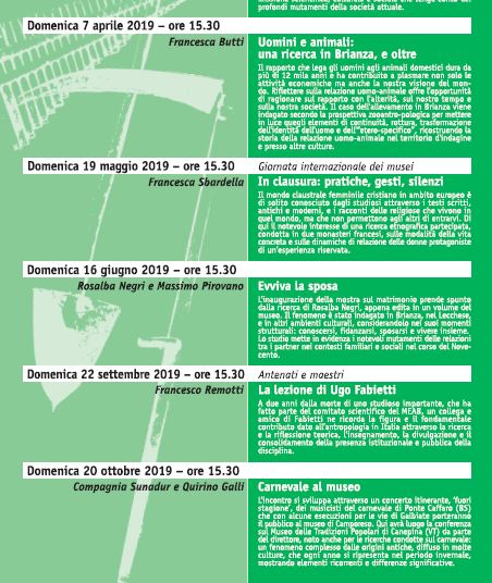 Ad aprire la rassegna, il prossimo 7 aprile alle 15.30 sarà l’incontro intitolato “Uomini e animali: una ricerca in Brianza, e oltre” curato da Francesca Butti Il rapporto che lega gli uomini agli animali domestici dura da più di 12 mila anni e ha contribuito a plasmare non solo le attività economiche ma anche la nostra visione del mondo. Riflettere sulla relazione uomo-animale offre l’opportunità di ragionare sul rapporto con l’alterità, sul nostro tempo e sulla nostra società. Il caso dell’allevamento in Brianza viene indagato secondo la prospettiva zooantropologica per mettere in luce quegli elementi di continuità, rottura, trasformazione dell’identità dell’uomo e dell’ “eterospecifico”, ricostruendo la storia della relazione uomo-animale nel territorio d’indagine e presso altre culture.
