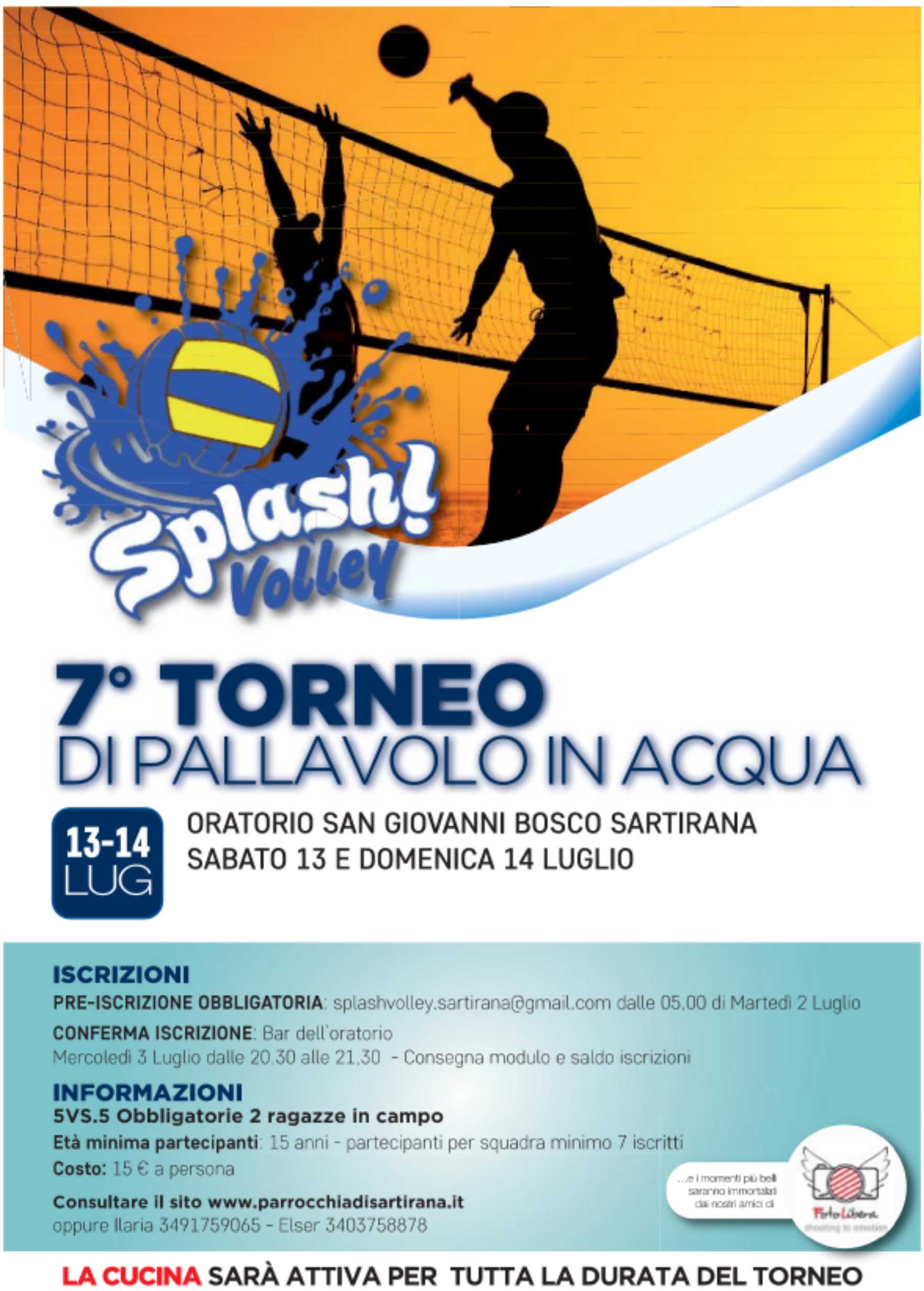 Sabato 13 e domenica 14 luglio all’oratorio San Giovanni Bosco di Sartirana andrà in scena la settima edizione del torneo di pallavolo in acqua. I partecipanti a questa iniziativa, dovranno effettuare una preiscrizione obbligatoria prima dell’evento. Quest’ultima sarà possibile perfezionarla dalle ore 5 di martedì 2 luglio, mandando una mail a splashvolley.sartirana@gmail.com. Mercoledì 3 luglio presso il bar dell’oratorio, dalle ore 20.30 alle 21.30, sarà possibile confermare l’iscrizione tramite la consegna del modulo e il pagamento. Per prendere parte a questo evento sarà necessario pagare una cifra di 15 euro. I partecipanti non potranno avere un’età inferiore ai quindici anni, e per ogni squadra devono essere presenti almeno due ragazze. La cucina sarà aperta durante tutto il torneo.