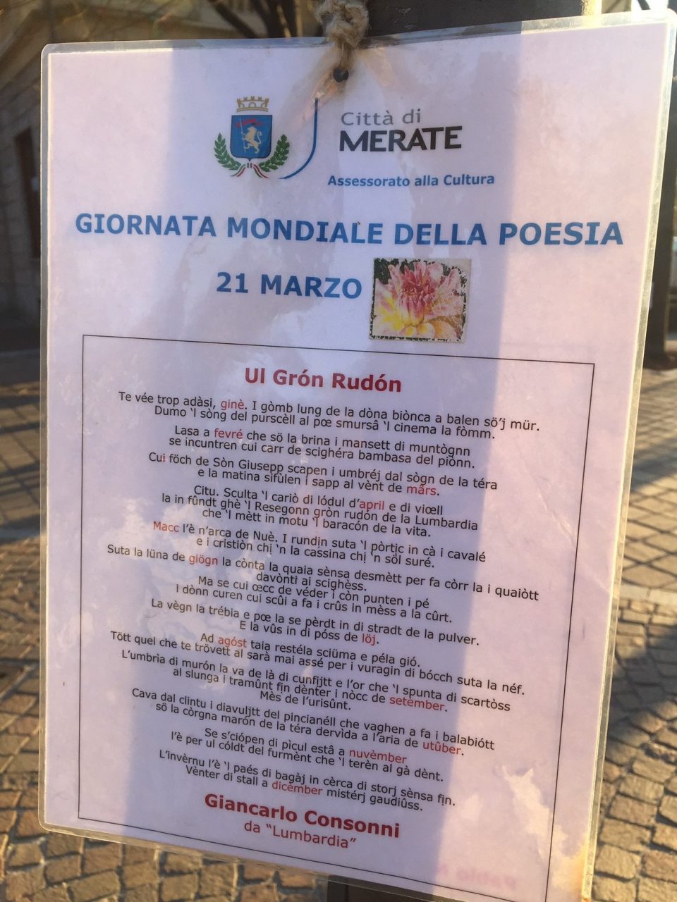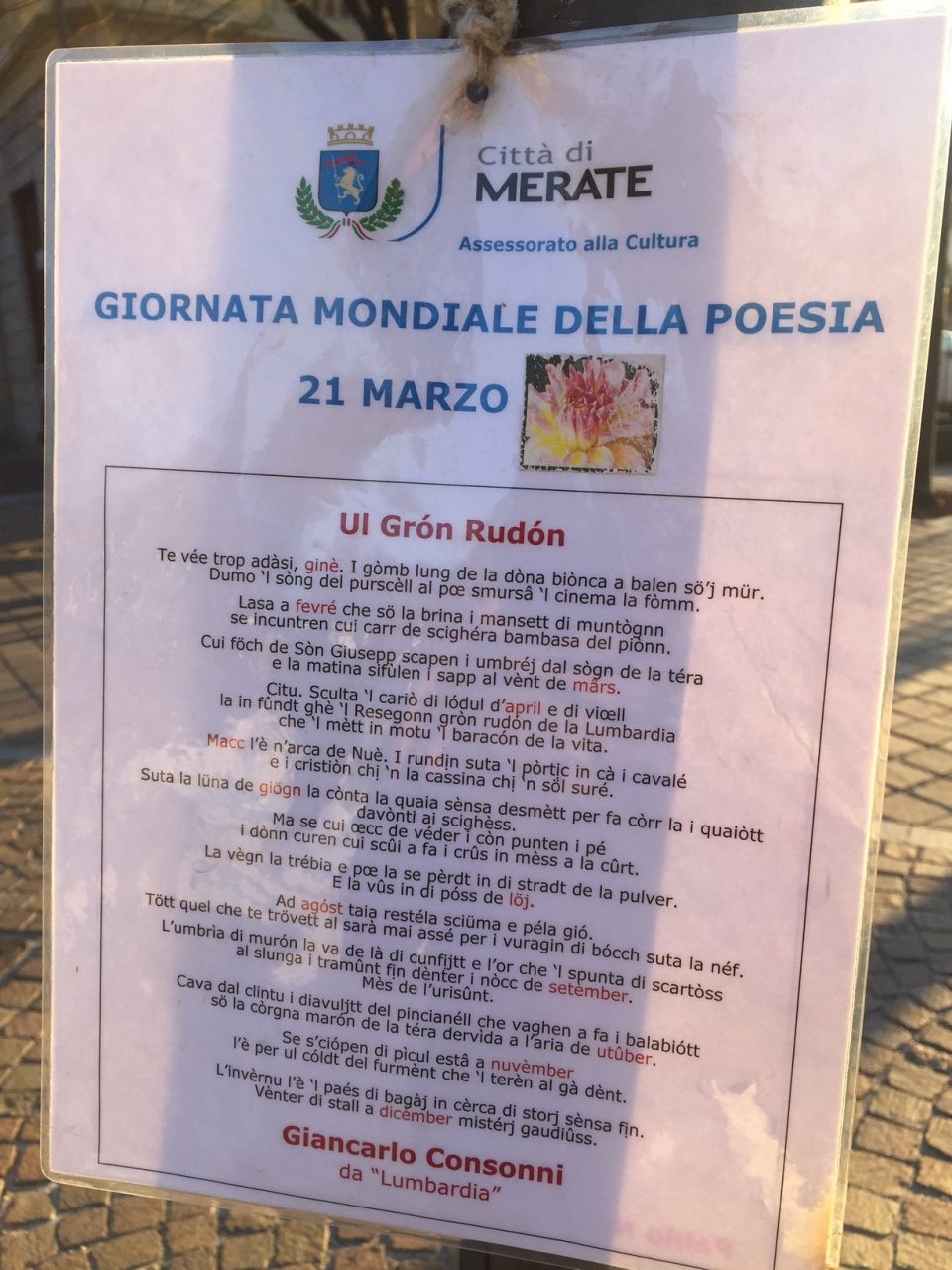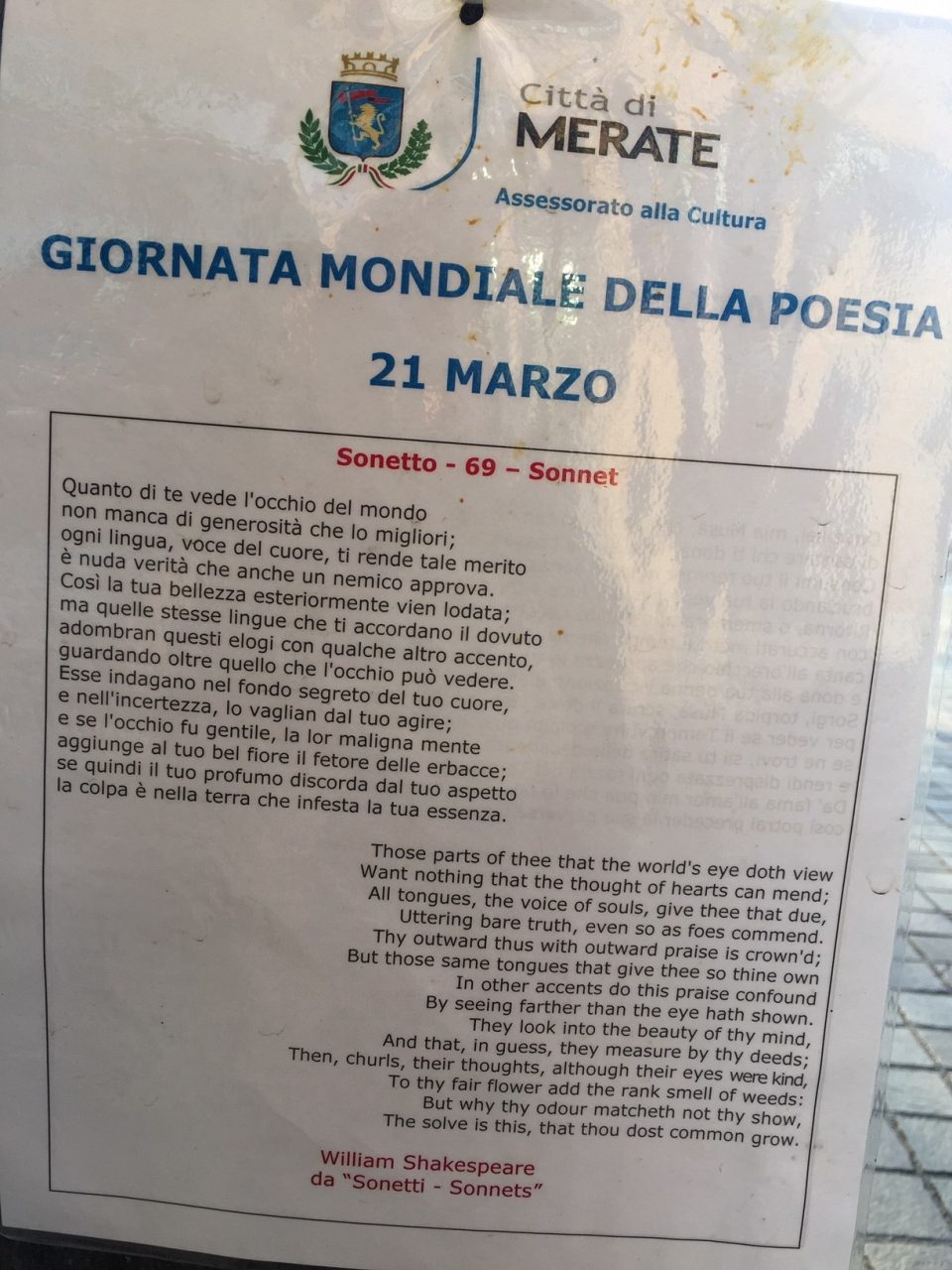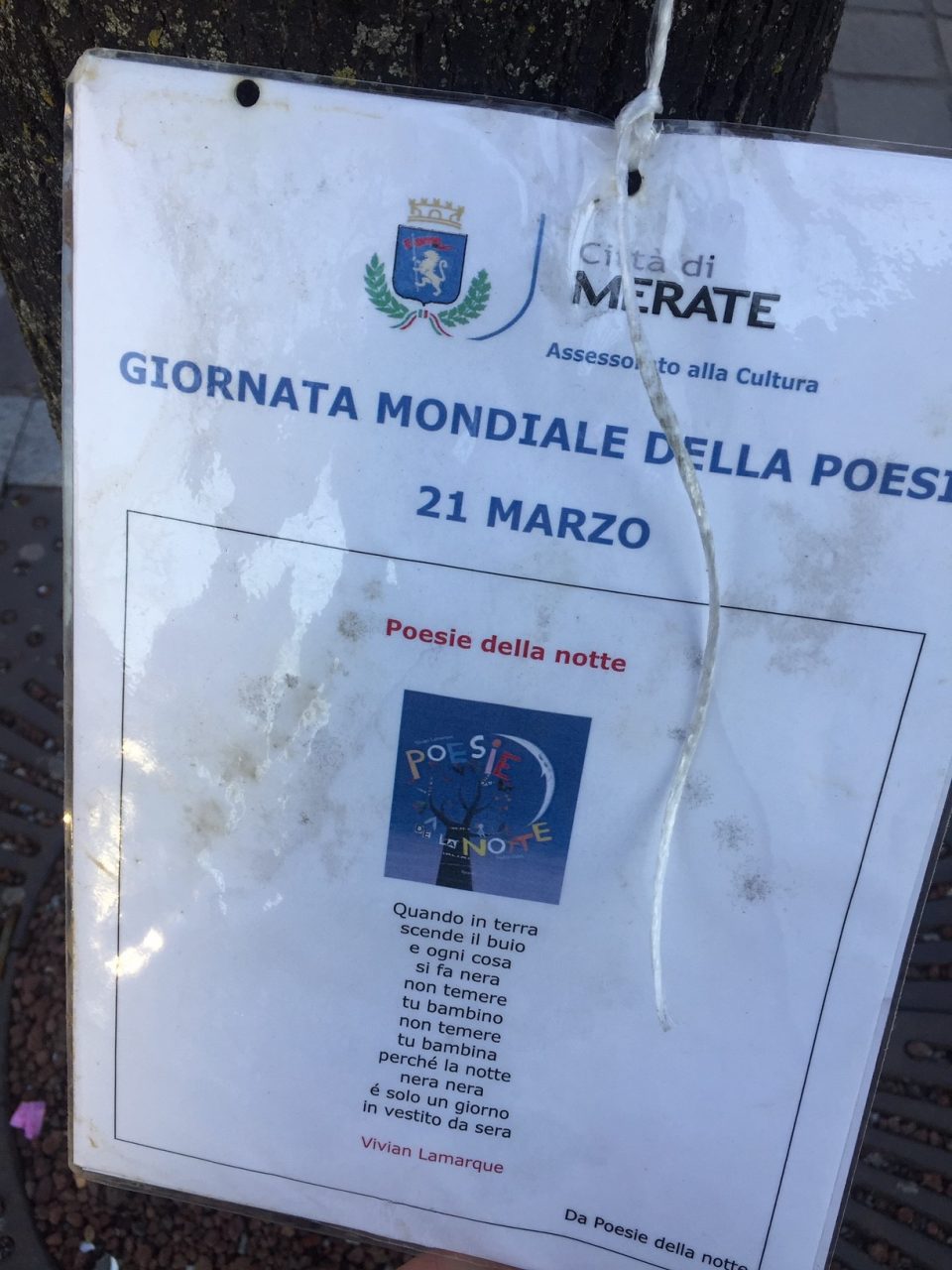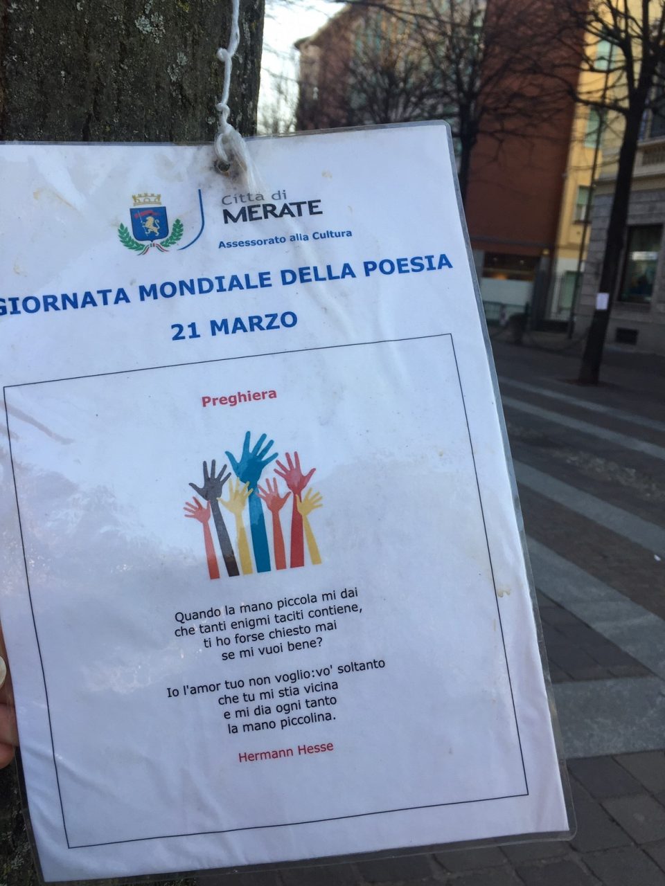 Shakespeare, Rodari, Hesse, Neruda e Quasimodo tra gli autori scelti. Non mancano però poeti locali e qualche forma dialettale. Via Carlo Baslini si è così arricchita di tanti fogli plastificati in balia del vento. Una trentina le poesie appese agli alberi che ornano il centro di Merate. E non sono pochi i curiosi che tra una compera e l’altra, o prima di entrare in ufficio, si fermano per una veloce lettura. Del resto sono tantissime in Italia e nel mondo le iniziative che celebrano questa giornata. Nel frattempo impazza sui social network l’hashtag #WorldPoetryDay.