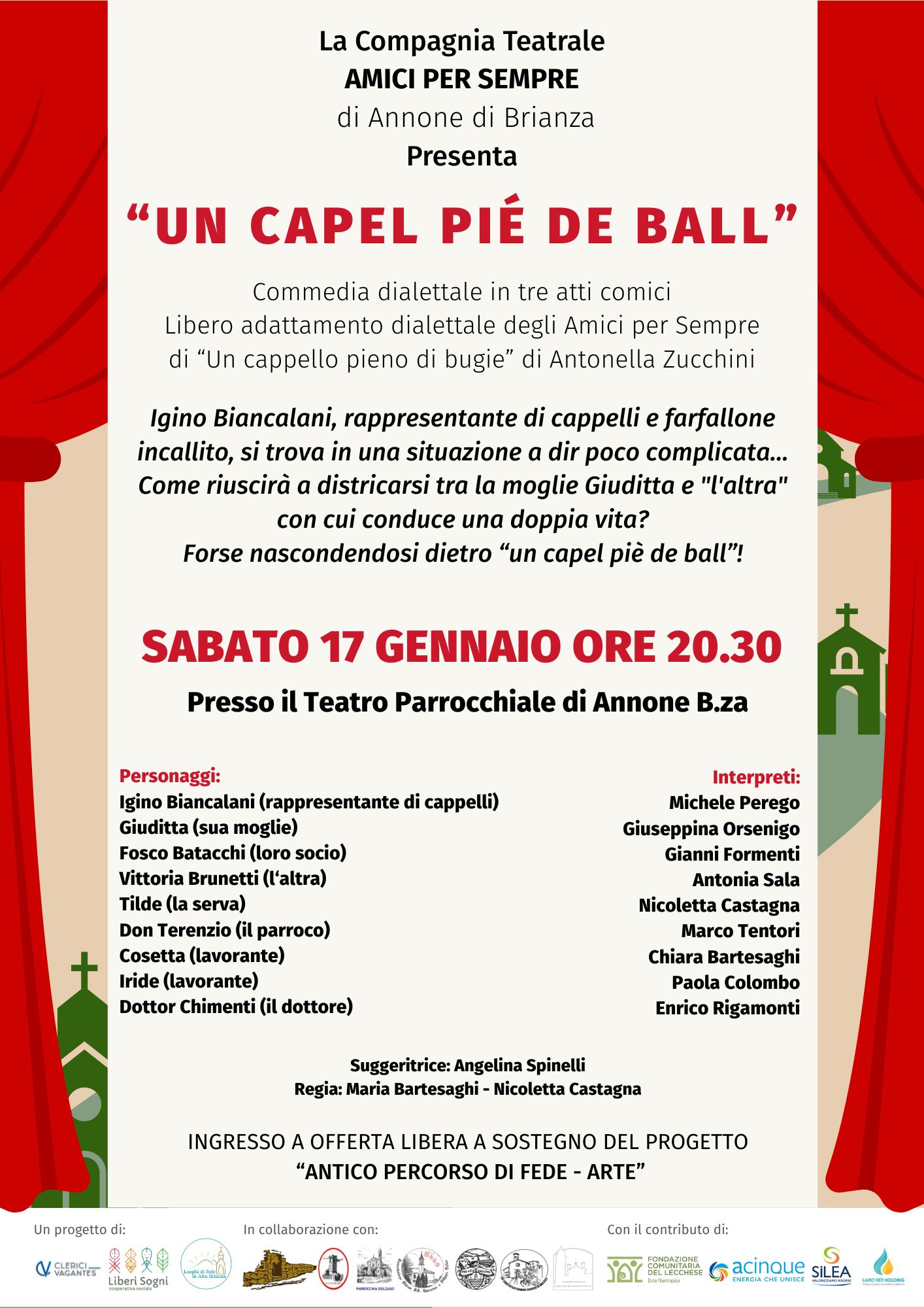Sempre ad Annone, sabato 17 gennaio ci sarà uno spettacolo di raccolta fondi all’Oratorio di Annone Brianza (via san Giorgio 7). Dalle 20:30, per grandi e piccini, andrà in scena Un capel pié de ball, libero adattamento dialettale della compagnia “Amici per sempre” di Un cappello pieno di bugie di Antonella Zucchini. L’ingresso allo spettacolo è a offerta libera e tutto il ricavato andrà a sostegno del progetto Antico percorso di fede – arte 2025/27. Si tratta del secondo evento di raccolta fondi del progetto di valorizzazione territoriale e culturale, dopo la cena a Castello Brianza del 21 novembre 2025 che ha riscosso un grandissimo successo.