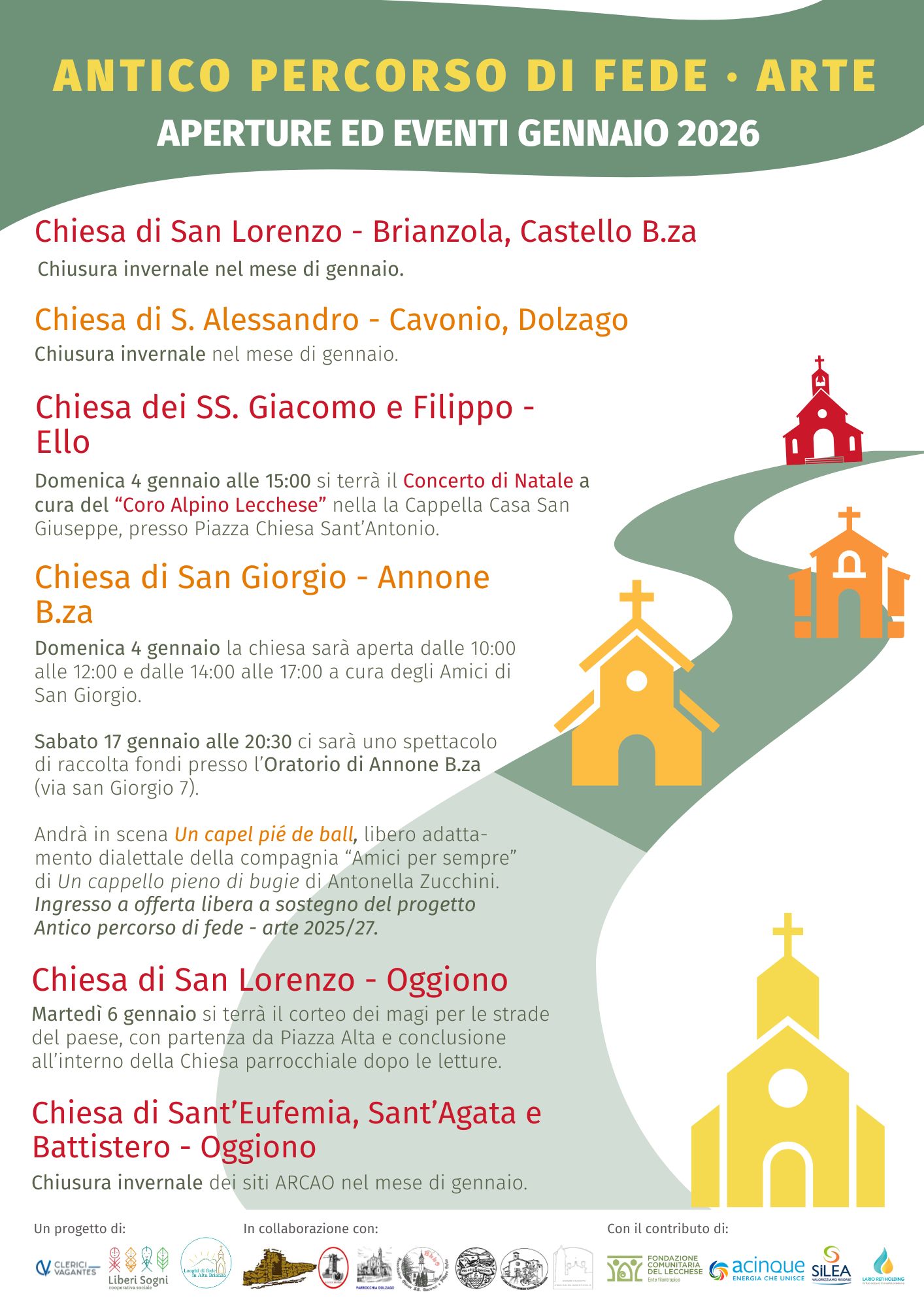 L’anno nuovo mantiene le vecchie e belle abitudini: sono in arrivo questo weekend e per tutto il mese di gennaio 2026 diverse iniziative di valorizzazione degli importanti siti religiosi dell’Oggionese che sorgono lungo l’Antico percorso di fede dell’Alta Brianza realizzate nell’ambito del progetto cofinanziato dal Fondo “Ambiente e Cultura” di Fondazione comunitaria del Lecchese Onlus, Acinque Energia, i Comuni soci di Lario Reti Holding e Silea SPA. Nel primo weekend di gennaio e nelle settimane successive Annone, Oggiono, Ello ospiteranno infatti alcuni eventi invernali imperdibili. Di seguito il dettaglio di tutte le iniziative.