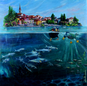 “Il sottosopra” è il tema centrale di questa personale. Antonella, attraverso le sue visioni introspettive, rappresenta con questa tematica un’astrazione del tema naturale. La mostra è la personale visione dei due mondi, il terreno e l’acquatico che trovano una linea di unione e d’inevitabile compenetrazione. In un’unica immagine sono racchiuse diverse prospettive e visioni: il visibile è affiancato dall’invisibile; le realtà da cartolina galleggiano sopra abissi inquietanti; la staticità del paesaggio è contrapposta alla dinamicità dei corpi. Le espressioni a volte divertite e quasi impertinenti degli animali rappresentati, in alcuni casi, testimoniano volutamente un mondo ormai estinto e, in altri, sono presenze di primo piano e contrastanti con lo spazio antropico quasi smorzando idealmente e contrapponendosi ai toni percettivi, spesso troppo severi e condizionati, dell’essere umano.