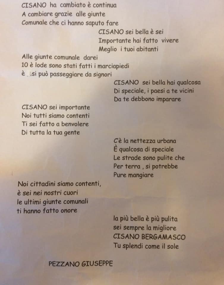 Giuseppe Pezzano, uno dei novantenni premiati durante la giornata, ha scritto e recitato una poesia composta per l’occasione. Il sindaco Andrea Previtali ha postato sul suo profilo facebook una foto della poesia, ringraziano il signor Pezzano.