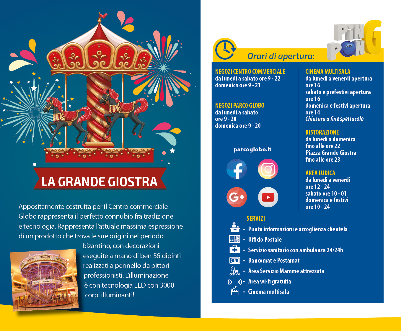 In secondo luogo perché all’interno troverete tutte le informazioni sugli eventi che il centro commerciale organizzerà nei prossimi tre mesi: concerti, gruppi di ballo, campioni mondiali di pattinaggio e tanti altri show tutti da scoprire. Inoltre, perché quest’anno abbiamo compiuto venticinque anni, e abbiamo deciso di raccontarvi qualcosa di noi. Infine, perché all’interno troverete numerosi buoni sconto, consigli di acquisto, gettoni omaggio. Insomma, perché noi siamo il Globo perché ci siete voi, e questo è un modo per ringraziarvi: raccontarvi le terre a cui tutti noi apparteniamo, mostrarvi come siamo stati in grado di crescere grazie alla vostra fedeltà.