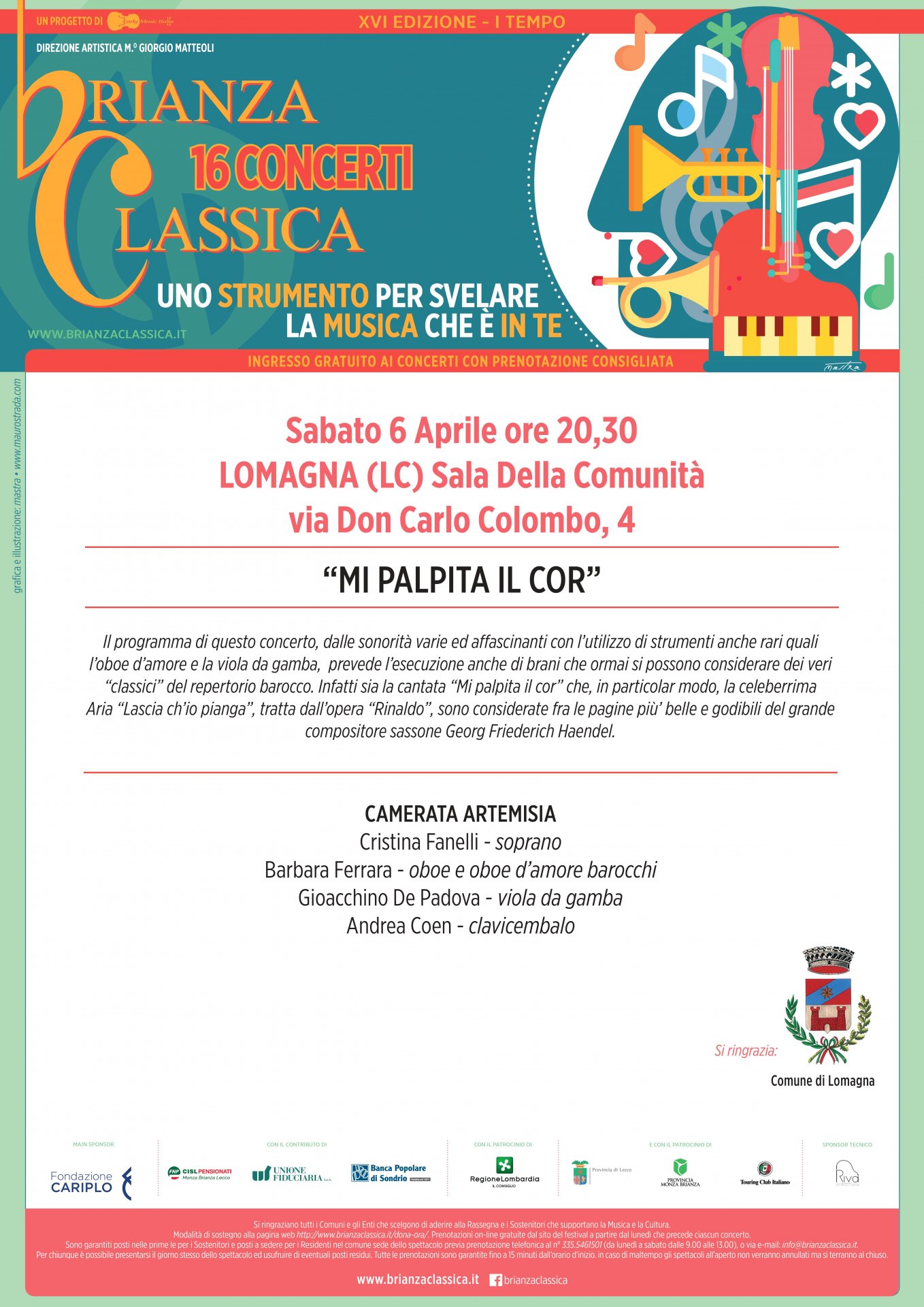 Brianza Classica fa tappa sabato 6 aprile alle 20.30 nella sala della Comunità di via don Carlo Colombo a Lomagna. La Camerata Artemisia suonerà un repertorio di brani classici barocchi.