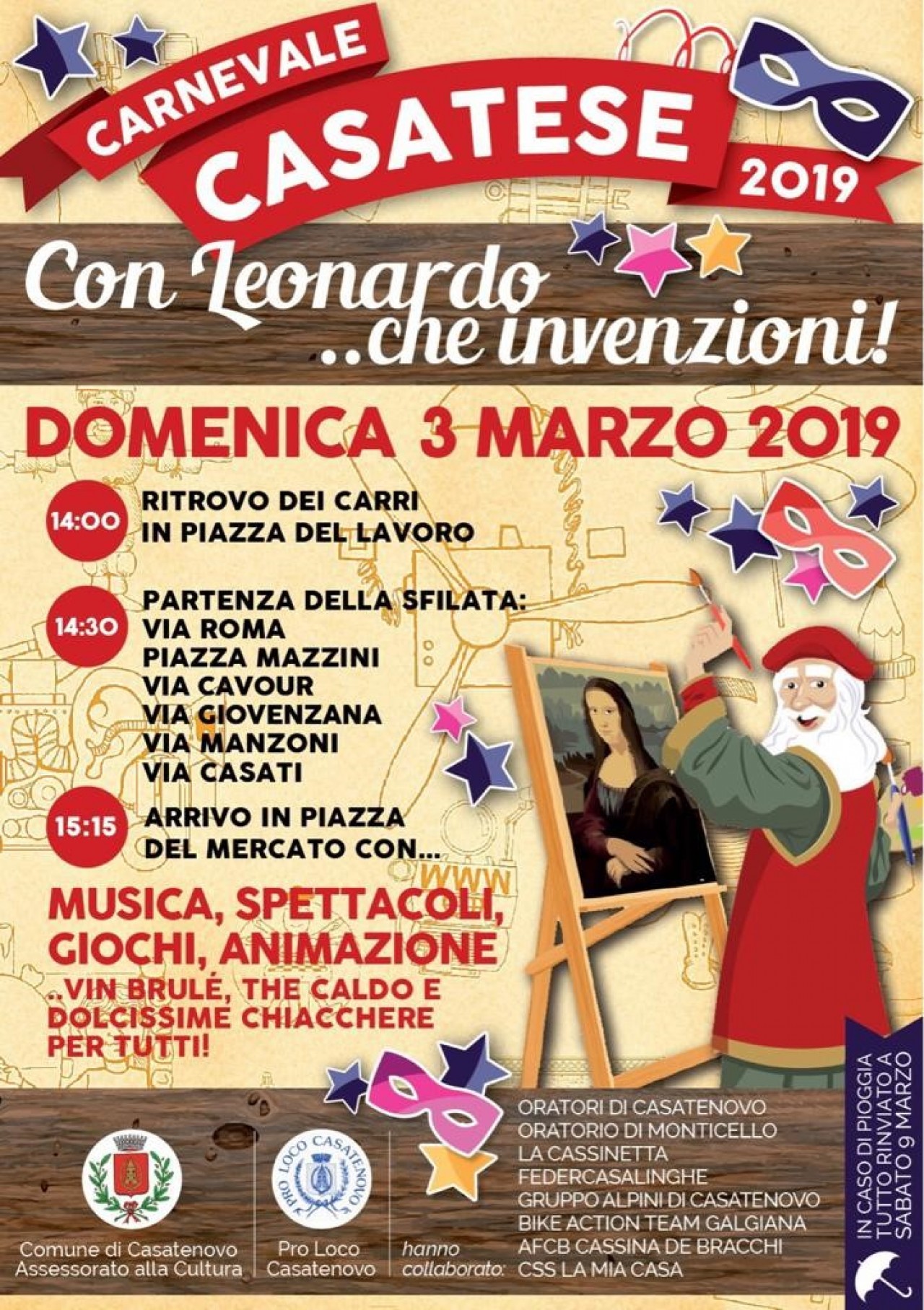 Domenica 3 marzo avrà luogo l’attesissima festa, che inizierà alle 14 con il ritrovo dei carri (a tema Leonardo da Vinci) in piazza del Lavoro. Alle 14.30 partirà una sfiziosa sfilata che passerà per le vie del paese per raggiungere la destinazione finale, ossia la piazza mercato. Alle 15.15 una festa spumeggiante attenderà l’arrivo dei carri, con tanto di musica, spettacoli, giochi e animazione. Sicuramente non mancherà del buon vin brulè, del tè caldo e le tradizionalissime chiacchiere. In caso di pioggia l’evento sarà rimandato a sabato 9 marzo con le medesime modalità. Per maggiori informazioni consultare il sito del comune.