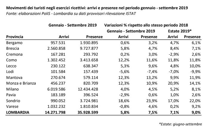 Interessanti anche i dati relativi ai flussi turistici dell’estate scorsa: da giugno a settembre 2019 gli arrivi in Lombardia sono aumentati rispetto allo stesso periodo del 2018 del 7,1% e del 9% per quanto concerne le presenze. Ecco i dati provinciali: Monza e Brianza arrivi +20,9%, presenze +14,1%; Sondrio +17% e +22%; Como +11,8% e +11,8%; Mantova +9,9% e +11,9%; Brescia +8,4% e +7,1%; Milano arrivi +5,2%, presenze + 8,1%; Lecco +4,8% e + 10%; Bergamo +4,7% e +6,1%; Pavia +1% e +2,6%; Cremona -2,9% e +2,6%; Varese +0,2% e +9,2%; Lodi con -7% di arrivi nel periodo estivo e -9,9% di presenze rispetto allo stesso periodo del 2018.