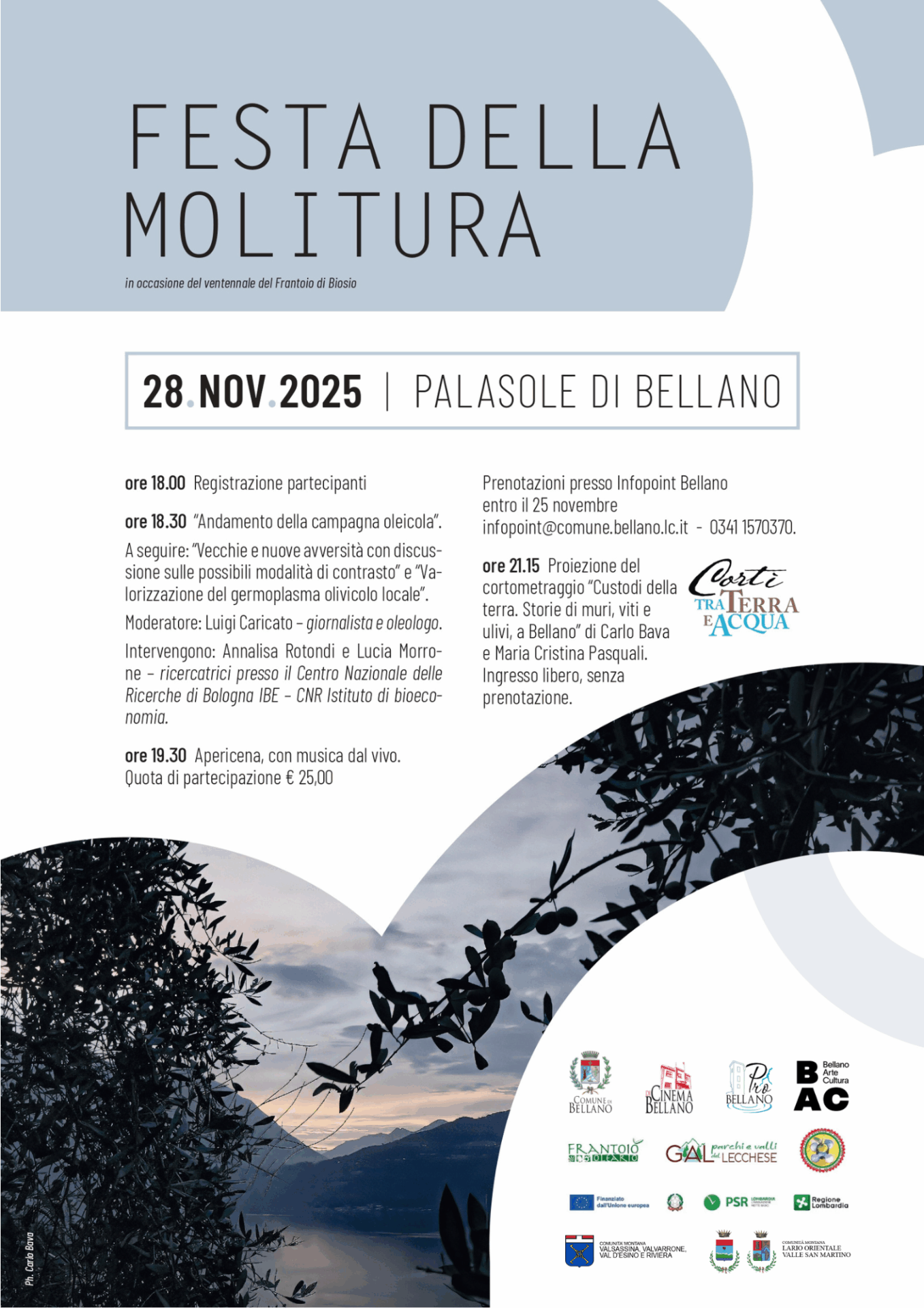 L’evento si inserisce nell’ambito della Festa della Molitura, organizzata in occasione del ventennale del Frantoio di Biosio.