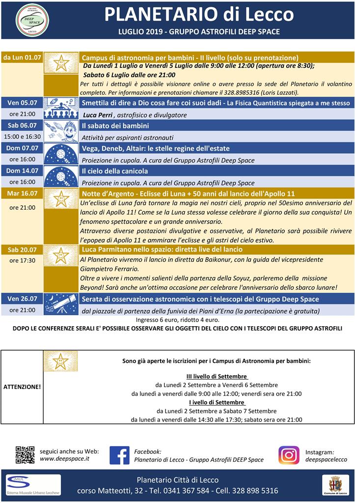 Luglio è il grande mese della Luna, nell’anno del cinquantennale dello sbarco di Apollo 11 e con un’eclisse che cade a puntino. Il Planetario civico di Lecco celebrerà i due avvenimenti in grande stile, e in simultanea, martedì 16, con la Notte d’Argento: a partire dalle 21, all’interno del Planetario e nel cortile saranno allestite diverse postazioni divulgative per ripercorrere l’impresa di Neil Armstrong e compagni, per conoscere da vicino il poderoso Saturno V, per dimostrare che l’uomo c’è davvero stato sulla Luna, e per conoscere il fenomeno dell’eclisse parziale che in tarda serata verrà osservata dal cortile del Planetario con una batteria di telescopi, insieme a Giove e Saturno che faranno bella mostra di sé oltre alle altre meraviglie del cielo estivo.