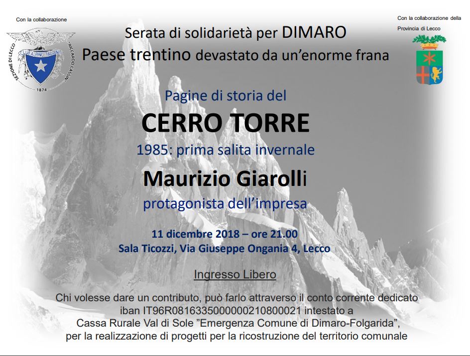 La serata di domani, martedì 11 dicembre 2018, che avrà luogo nella Sala Don Ticozzi a partire dalle 21, è organizzata da CAI Lecco “Riccardo Cassin”. L’obiettivo è quello di raccogliere fondi da destinare a Dimaro, la località della Val di Sole colpita lo scorso 29 ottobre da una frana causata da abbondanti piogge. Protagonista della serata sarà Maurizio Giarolli, che vive proprio in Val di Sole.