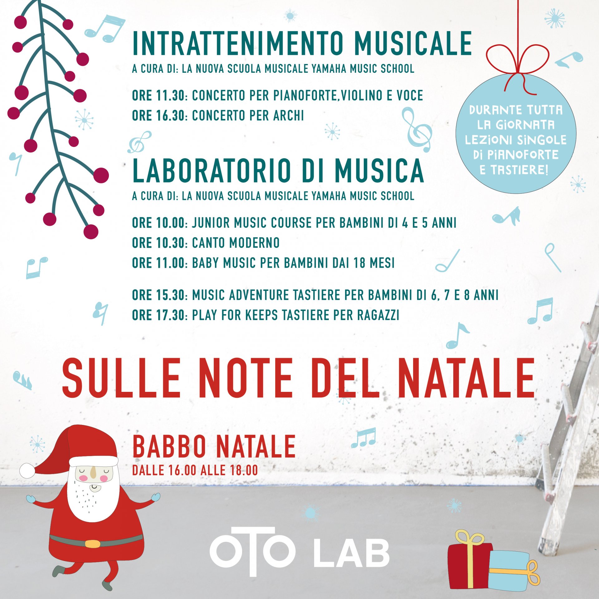 L’ingresso a Oto Lab in occasione dell’evento sarà libero e gratuito, così come gratuiti saranno i laboratori di musica proposti da Nuova Scuola Musicale Todeschini, che richiederanno unicamente la registrazione alle diverse attività e saranno rivolti ad adulti e bambini. Info e prenotazioni: www.nuovascuolamusicale.com.  Gli appassionati potranno anche assistere a due concerti di Natale alle ore 11: 30 (pianoforte, violino e voce) e 16:30 (concerto di archi – Trio Artemisia), ma non mancheranno momenti musicali a sorpresa nel corso della giornata.