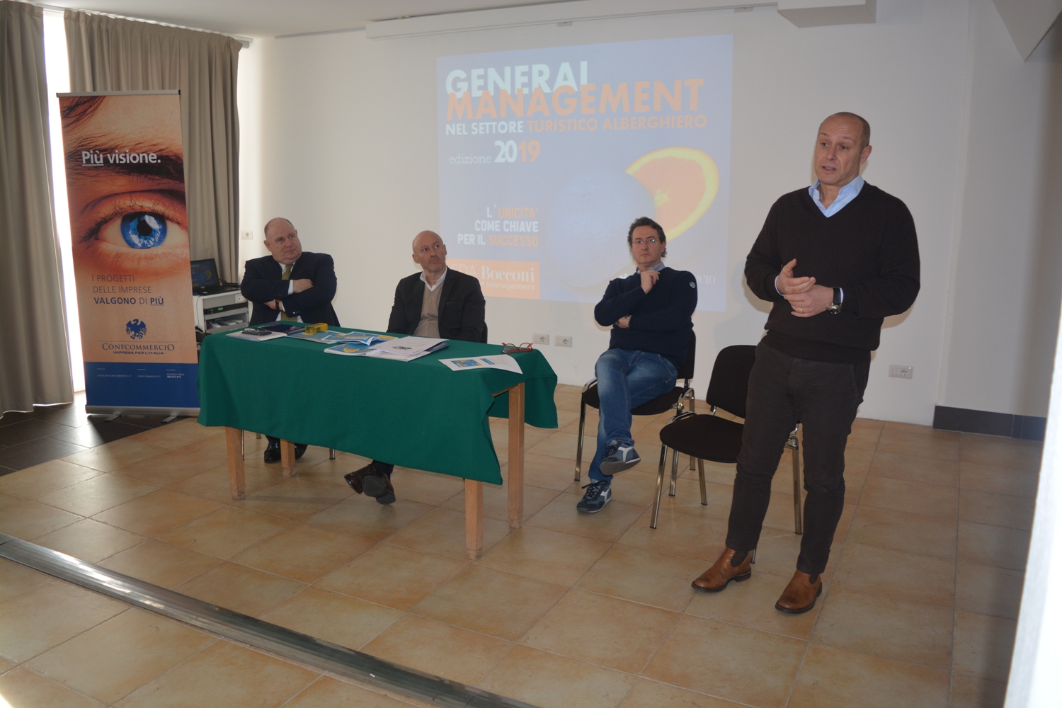 Esordio sul Lago per l’Università del turismo. E’ iniziato da Varenna ieri,  martedì 29 gennaio 2019,  il tour di presentazione del corso di Alta formazione “General Management nel settore Turistico Alberghiero”, voluto da Confcommercio Lecco, in collaborazione con SDA Bocconi. Per promuovere il Master 2019 al via nel mese di aprile, Confcommercio Lecco ha infatti deciso di incontrare gli aspiranti corsisti portando anche due testimonial, scelti tra quanti hanno preso parte alla prima edizione svoltasi nel 2018: Fabio Dadati e Antonio Branduardi. A illustrare il programma, presso la Sala Polifunzionale “Rosa e Marco De Marchi”, sono stati loro, insieme ovviamente al presidente di Confcommercio Lecco, Antonio Peccati e al direttore Alberto Riva.
