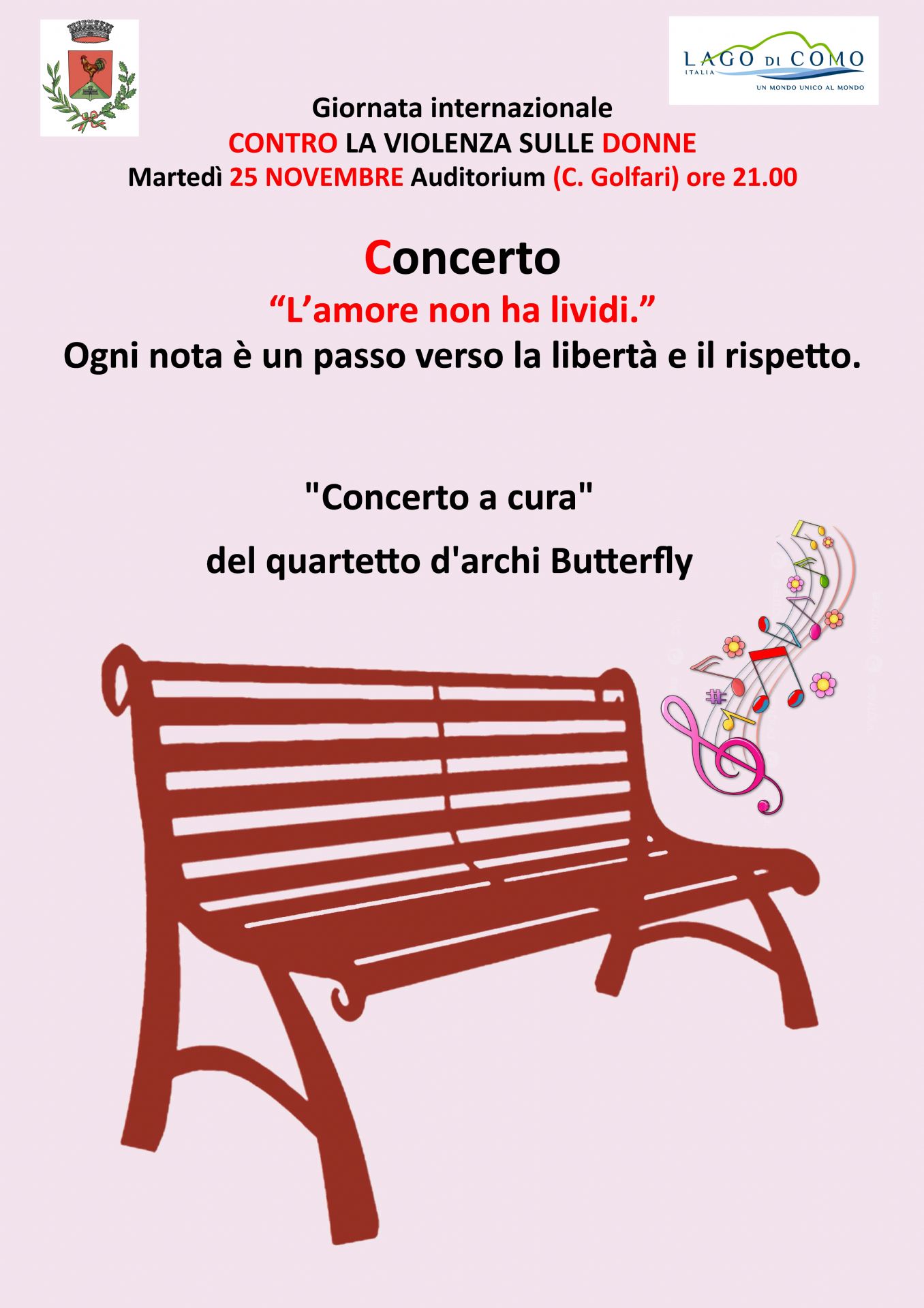 Si prosegue martedì 25 novembre con “L’amore non ha lividi” in occasione della Giornata internazionale per l’eliminazione della violenza sulle donne. Ogni nota è un passo verso la libertà e il rispetto – Concerto a cura del quartetto d’archi Butterfly. Appuntamento alle 21 nell’Auditorium comunale “Cesare Golfari”. Ingresso libero.