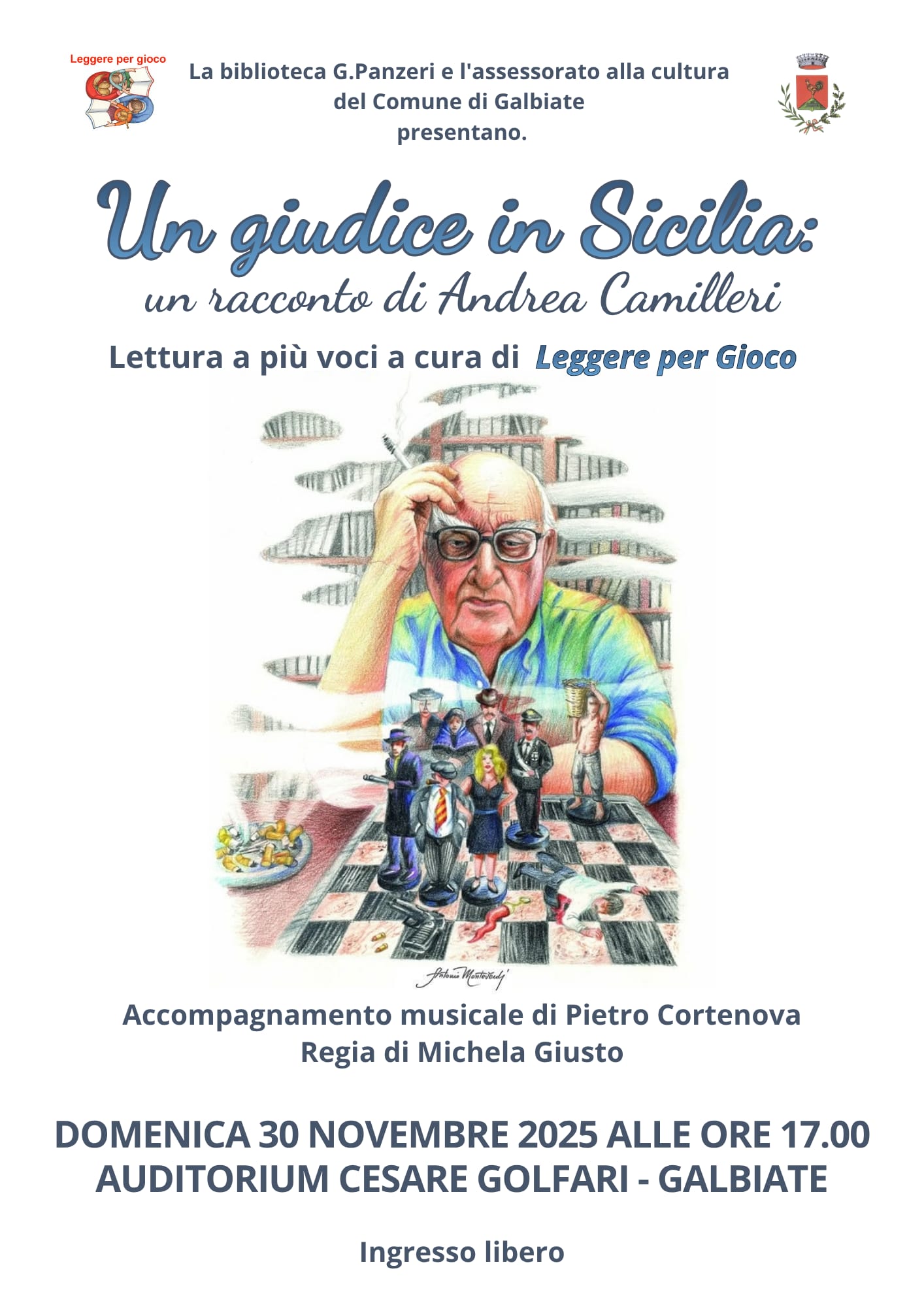 Si conclude domenica 30 novembre alle 17 con “Un Giudice in Sicilia”, un racconto di Andrea Camilleri – lettura a più voci a cura di Leggere per gioco. Accompagnamento musicale di Pietro Cortenova, regia di Michela Giusto. Appuntamento alle 17 nell’Auditorium “Cesare Golfari” – piazza Golfari – Galbiate. Ingresso libero.