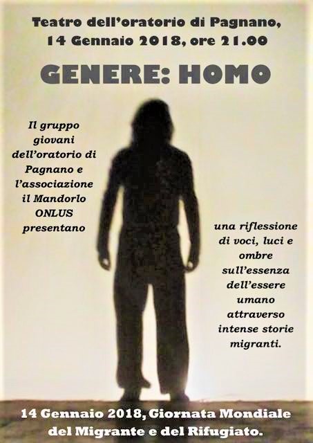 Andrà in scena sabato 14 gennaio alle ore 21 nel teatro dell’oratorio di Pagnano. Genere Homo è la proposta accolta dal gruppo giovani della parrocchia di san Giorgio. Obiettivo della serata riflettere sull’essenza del genere umano attraverso le intense testimonianze dei migranti.