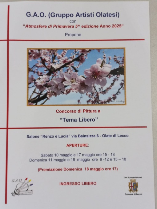 Si sono svolte nella giornata di oggi, domenica 18 maggio 2025, le premiazioni della quinta edizione della mostra “Atmosfere di primavera”, promossa dal Gao (Gruppo Artisti Olatesi) nel salone dell’oratorio di Olate.