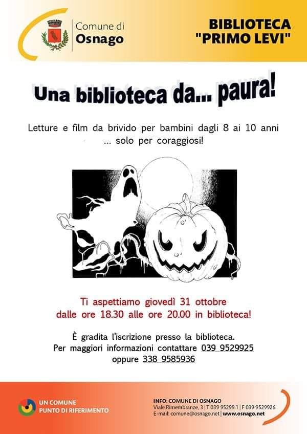 Saranno inevitabilmente paurose le «Letture ad alta voce» organizzate per il pomeriggio del 31 ottobre dalle volontarie della biblioteca civica Manzoni di Merate. L’appuntamento per i bambini dai 4 agli 8 anni è fissato alle 17 nelle sale di piazza Riva Spoleti. Per iscrizioni e informazioni rivolgersi in biblioteca oppure chiamare il numero 0399903147. Il pomeriggio è riservato a un massimo di 25 bambini. Si rivolgerà invece ai ragazzi e alle ragazzi che frequentano le scuole medie e superiori, la «Settimana di paura» organizzata dal Centro di Aggregazione Giovanile nella struttura in vicolo Strecciolo, all’interno del parco di Villa Confalonieri. Dal 28 al 31 ottobre al Cag si svolgeranno attività diverse tra cui la visione di un film e pomeriggio di giochi, e la vera e propria festa di Halloween, giovedì dalle 16.30 alle 21 (mail: cag.merate@retesalute.org; cell: 348.4589617).