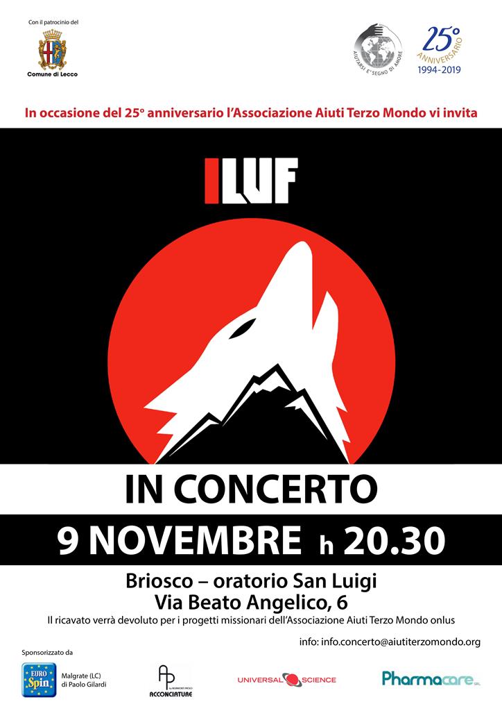 Domani, sabato 9 novembre alle 20.30 all’oratorio San Luigi di via Beato Angelico 6 a Briosco si terrà il grande concerto de I Luf organizzato per il 25° anniversario dell’Associazione Aiuti Terzo Mondo onlus di Lecco, con il patrocinio del Comune di Lecco.