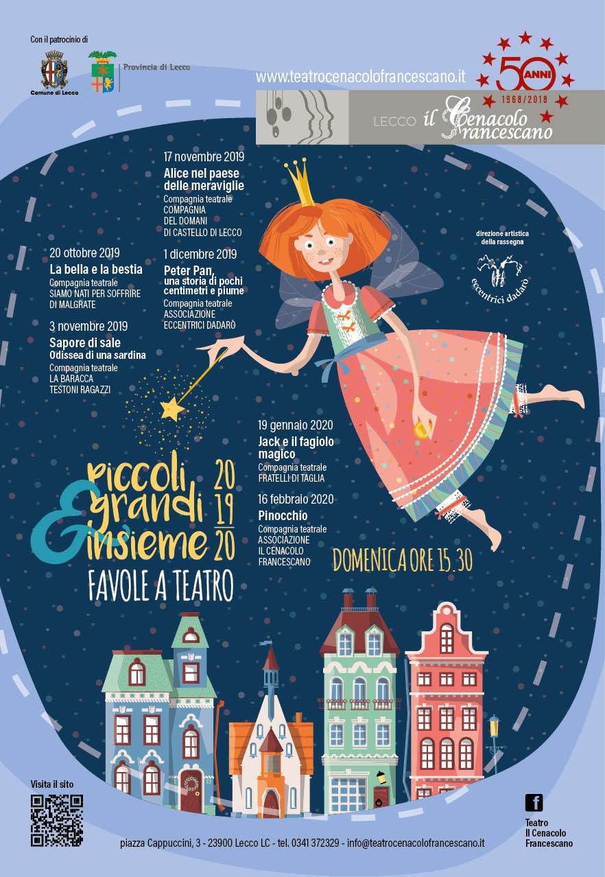 Anche per questa stagione il teatro del Cenacolo Francescano si trasforma in uno spazio in cui grandi e piccoli possono tornare a sognare, raccogliendosi attorno alla scatola magica del palcoscenico, per moltiplicare la realtà colorandola con l’immaginazione e la fantasia e guardandola con gli occhi ingenui dei bambini Alla fine di ogni rappresentazione, nel salone dell’oratorio femminile, sarà possibile approfittare di una merenda a base di cioccolata e biscotti.