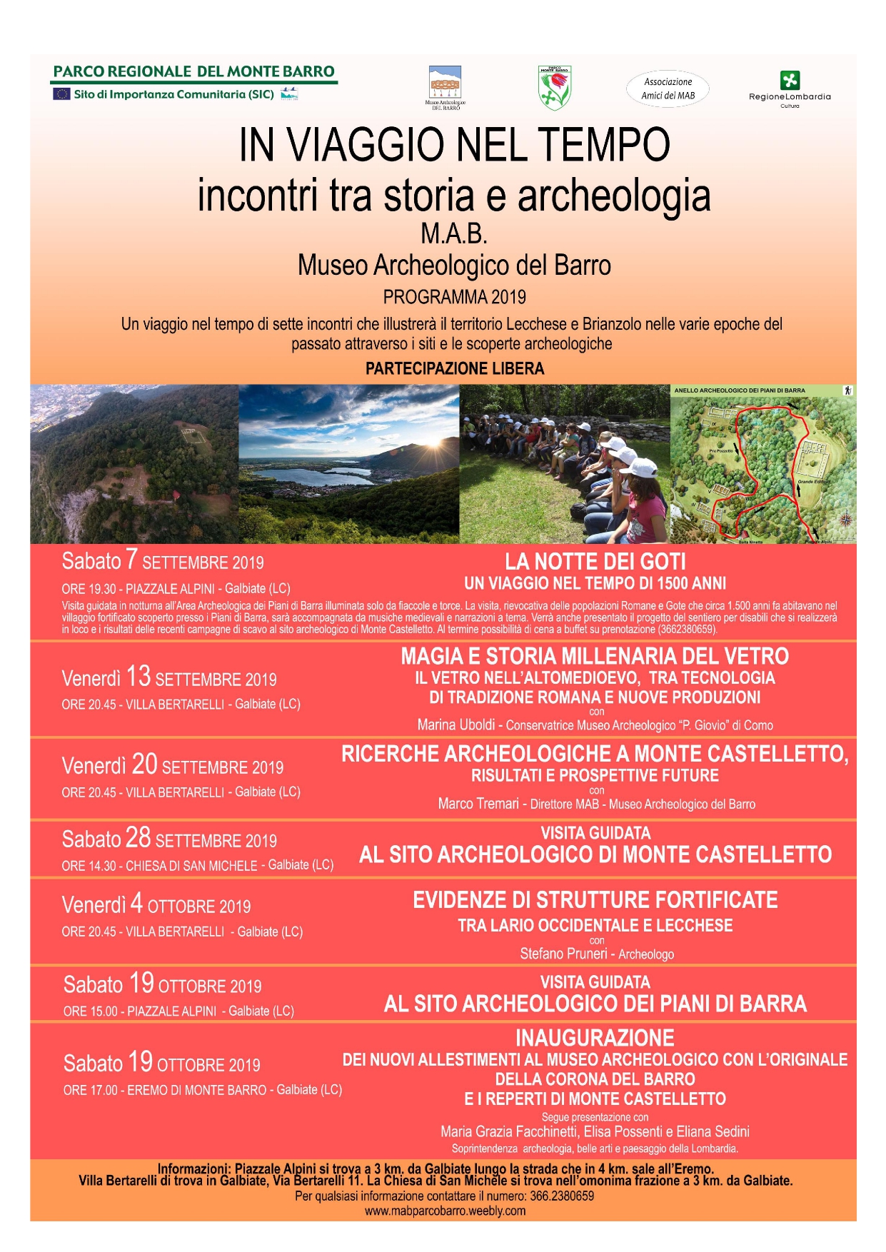 La rassegna, iniziata sabato 7 settembre con il consueto appuntamento della Notte dei Goti, prevede un ricco programma di quattro conferenze a Villa Berterelli (sede del Parco Monte Barro) e all’Eremo Monte Barro, dove sarà possibile visitare il Museo Archeologico. Terminerà poi sabato 19 ottobre con l’inaugurazione dei nuovi allestimenti con i reperti rinvenuti a Monte Castelletto e l’esposizione al pubblico della corona pensile rinvenuta un trentennio fa nel corso degli scavi del Grande Edificio ai Piani di Barra. Previste infine due visite guidate da archeologi alle Aree dei Piani di Barra, con le importanti testimonianze dell’abitato di epoca Gota, e di Monte Castelletto, con la fortificazione medievale riportata alla luce di recente. La partecipazione a tutti gli appuntamenti in programma è libera.