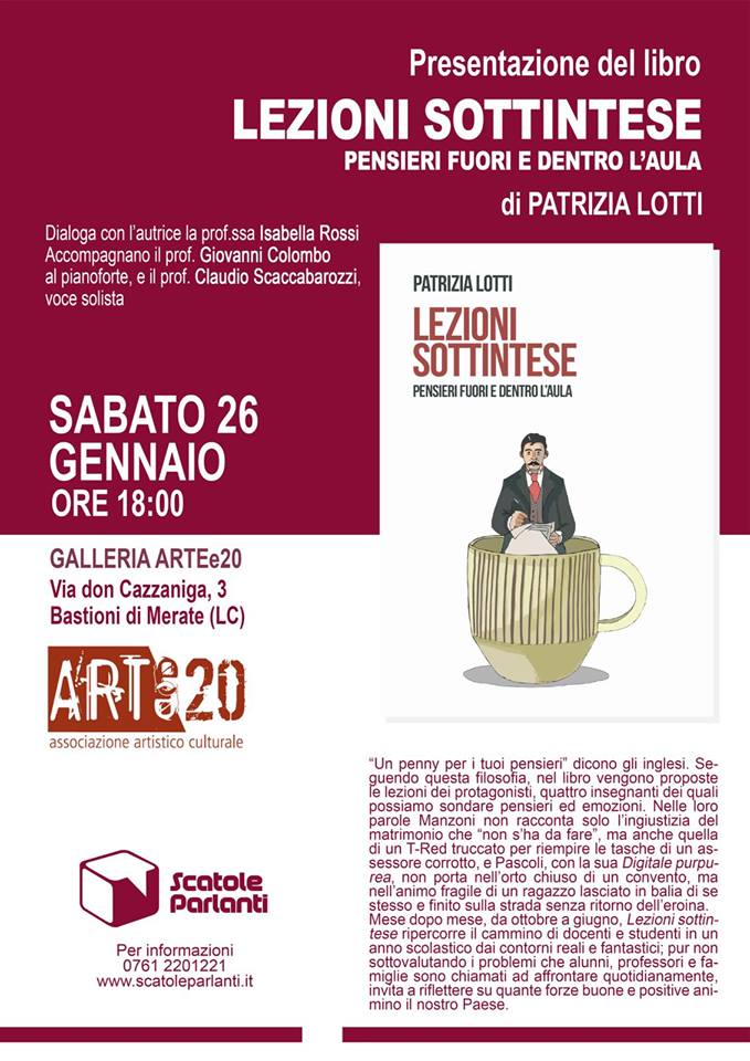 L’associazione artistico culturale meratese Artee20, che dal 2014 promuove l’arte e la cultura nel territorio, annuncia la presentazione del libro di Patrizia Lotti: “Lezioni sottintese pensieri fuori e dentro l’aula”. L’evento ad ingresso libero prenderà luogo ai Bastioni in via Cazzaniga 3, a Merate sabato alle ore 18.