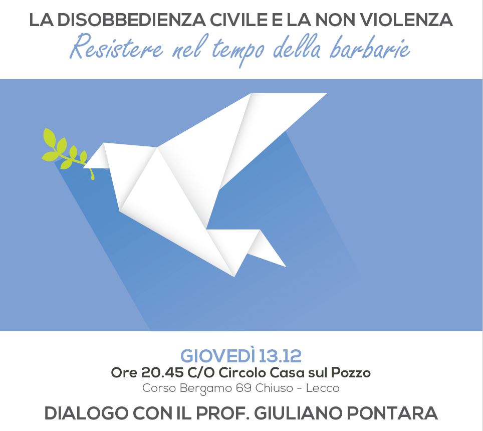L’appuntamento sulla disobbedienza civile e la non violenza è previsto per il 13 dicembre alle 20.45, alla Casa sul Pozzo, in Corso Bergamo 69 a Lecco. L’incontro con il filosofo Giuliano Pontara è promosso dall’associazione Comunità di Via Gaggio assieme a L’Altra Via.