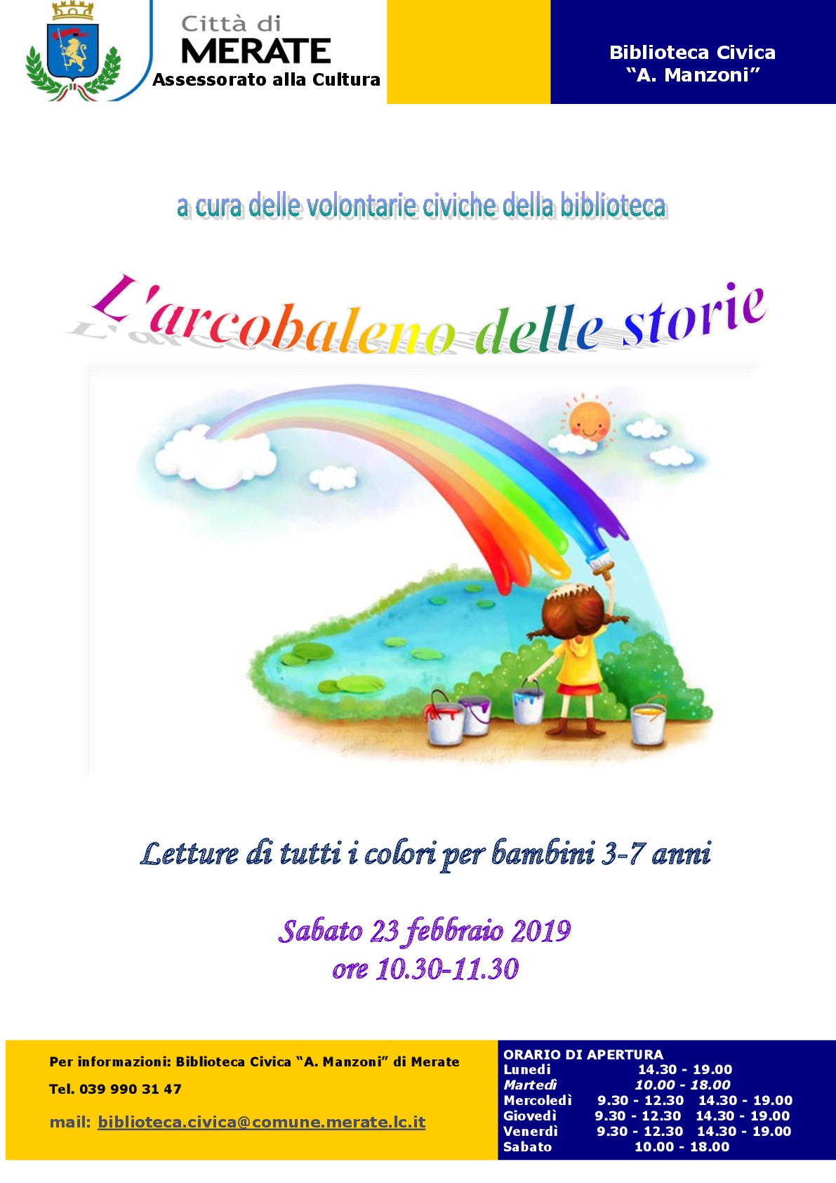 L’iniziativa “L’arcobaleno delle storie” si terrà sabato 23 febbraio nella biblioteca civica di Merate dalle ore 10.30 alle 11.30. Durante l’incontro, le volontarie della biblioteca Manzoni intratterranno i piccoli con delle letture di tutti i colori. L’evento è dedicato a tutti i bambini dai 3 ai 7 anni.