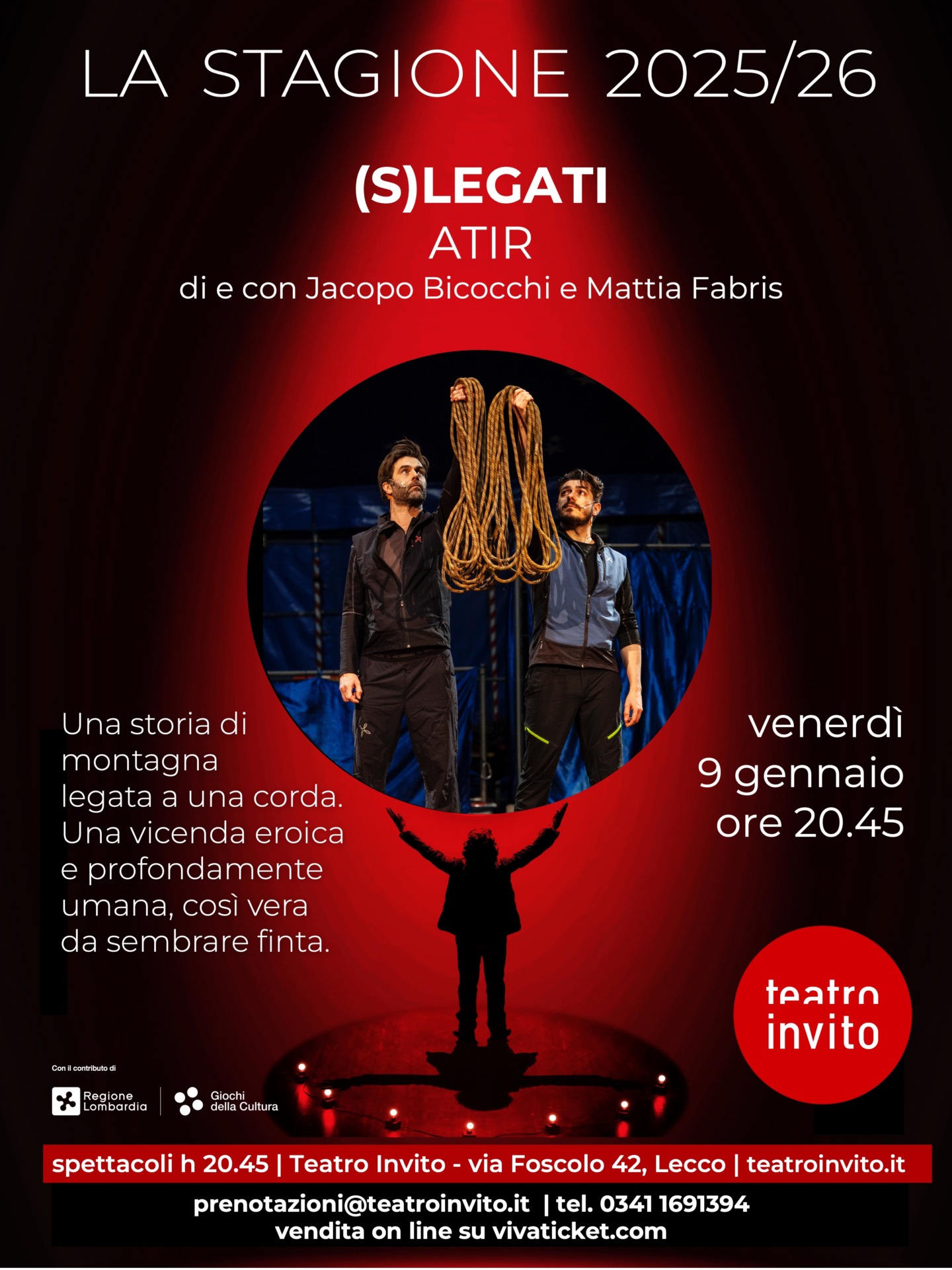 “Una storia di montagna legata a una corda. Una vicenda eroica e profondamente umana, così vera da sembrare finta”. Riparte la stagione di Teatro Invito con lo spettacolo “(S)legati” a cura di Atir Teatro, di e con Jacopo Bicocchi e Mattia Fabris. Appuntamento venerdì 9 gennaio 2026 alle 20.45.