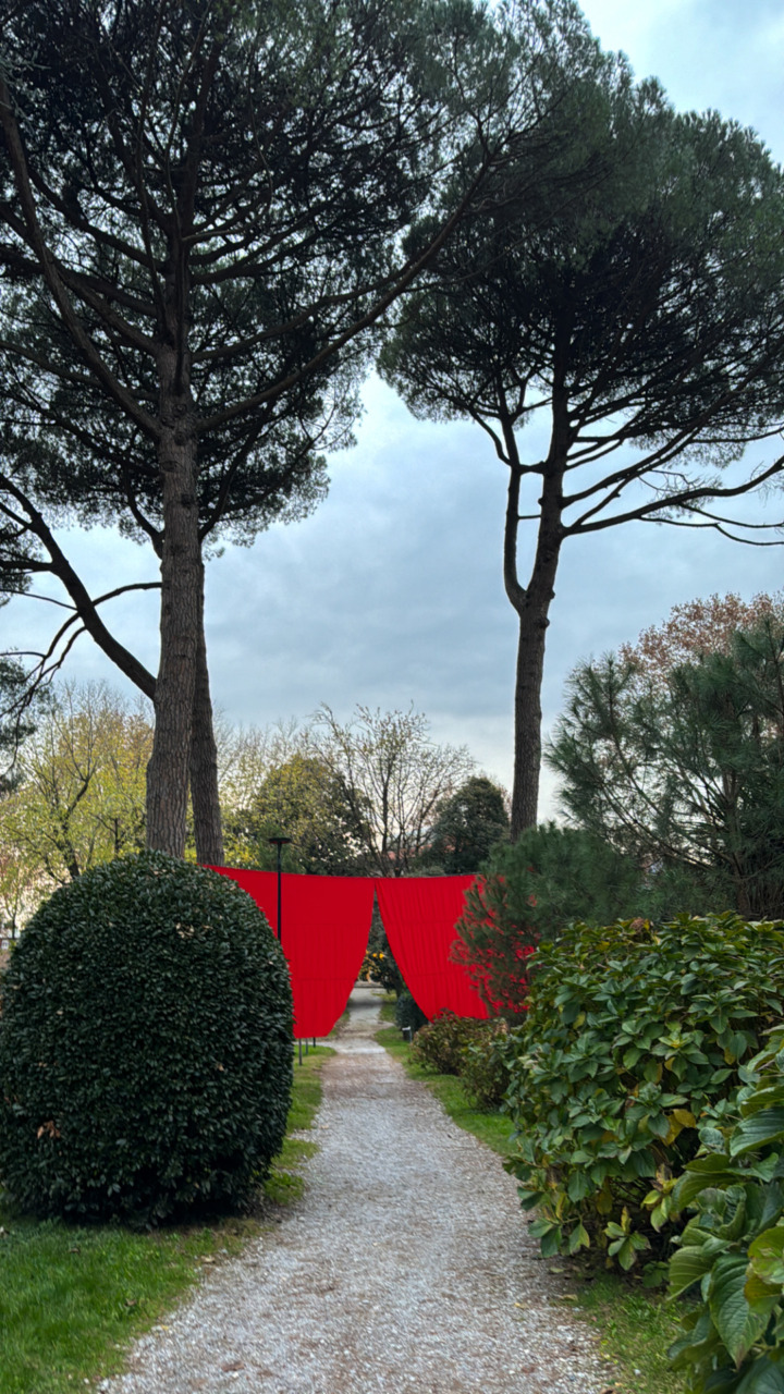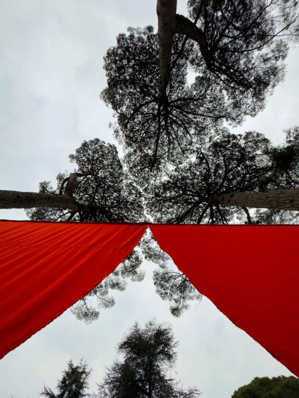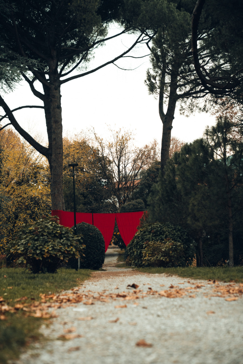 E così, tra i pini marittimi di Villa Gomes, a cinque metri d’altezza compare un grande drappo rosso che richiama un sipario sospeso: un invito a entrare nel parco come fosse una scena teatrale, in un passaggio che rompe la quotidianità. Sul lungolago, una lunghissima striscia di tessuto — 100 metri per 70 — si intreccia tra i 15 platani che costeggiano il centro storico, trasformandoli in un corridoio narrativo che scorre accanto all’acqua.