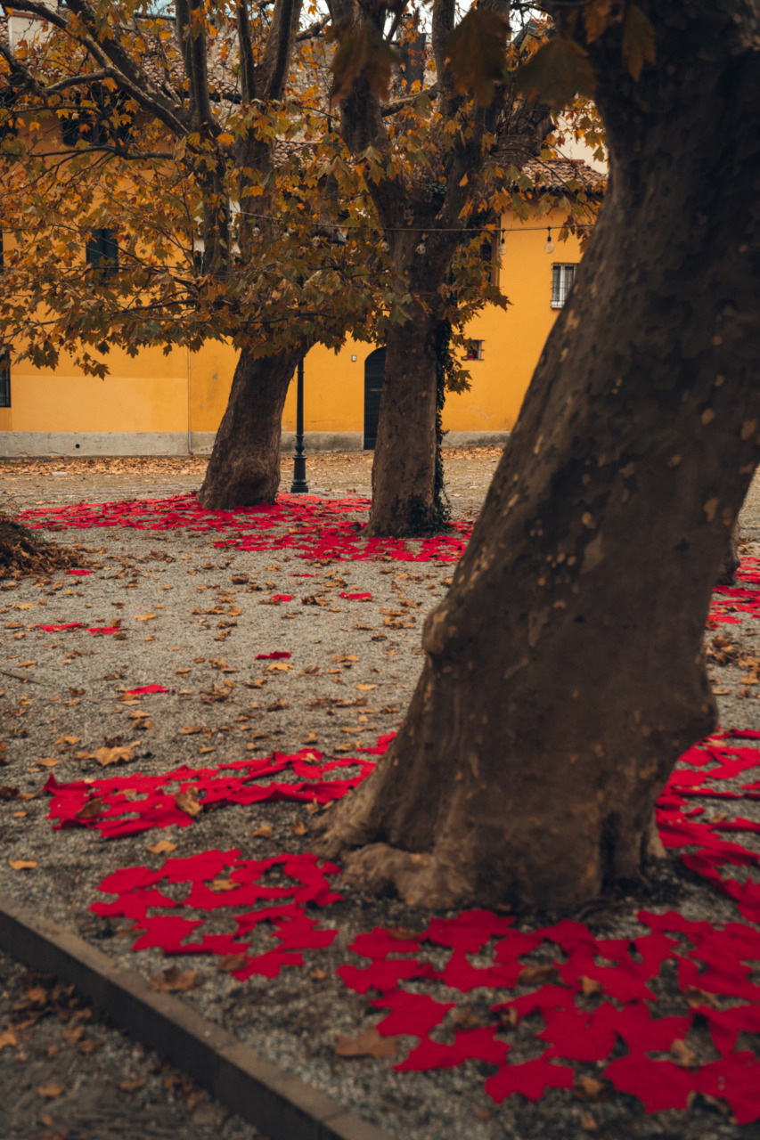 A Piazza Era, storico luogo di ritrovo dei pescatori, un tappeto di foglie rosse realizzate dalle maestranze del territorio si dispone come una rete: un omaggio poetico alla tradizione, alla memoria e al gesto antico della pesca. Sono oltre 500 metri lineari di tessuti, forniti dall’azienda Limonta, leader internazionale del settore, e lavorati grazie alla collaborazione di numerose imprese e maestranze locali. Un impegno corale che rende la città protagonista di un nuovo modo di concepire il rapporto tra cultura, impresa e paesaggio urbano.