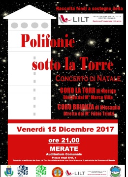 Il concerto di Natale per sostenere la Lilt è in programma per venerdì 15 dicembre.  A favore della Lega contro i tumori si esibiranno  il coro di Merate “La torr”, diretto dal maestro Marco Villa, e il Coro Brianza di Missaglia, diretto dal maestro Fabio Triulzi. L’appuntamento è quindi fissato per le ore 21 all’auditorium comunale di Merate. L’ingresso è libero.