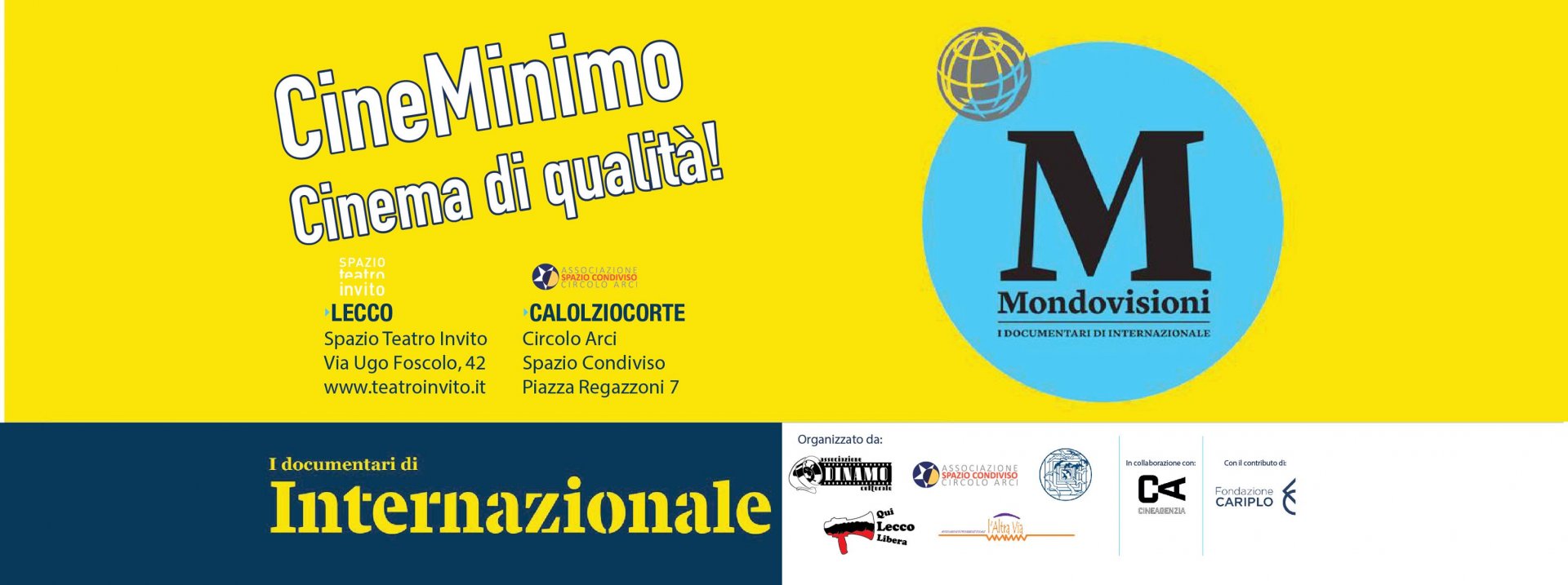 Per la prima volta a Lecco e Calolziocorte Associazione Dinamo Culturale, Circolo Arci Spazio Condiviso, Qui Lecco Libera, Associazione L’Altra Via e Associazione Il Gabbiano Onlus presentano “Mondovisioni: – documentari di Internazionale”- Nell’ambito della rassegna CineMinimo verranno proposti a maggio e giugno, tra Lecco e Calolziocorte, gli 8 documentari selezionati dalla rivista Internazionale per il suo annuale festival di Ferrara. Dalla alt-right americana al populismo europeo, dal radicalismo islamico alla crisi venezuelana, al significato e al futuro della democrazia, sono otto i temi e i documentari della nuova rassegna Mondovisioni curata da CineAgenzia in collaborazione con il settimanale Internazionale.