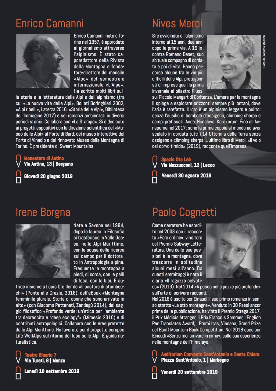 L’incontro a Lecco, così come i restanti appuntamenti a Monza il 16 settembre con Irene Borgna e a Morbegno il 20 settembre con Paolo Cognetti, sarà a ingresso gratuito su prenotazione (i posti sono limitati) inviando una mail a redazione@orobie.it o telefonando allo 035.240.666. Per informazioni https://tinyurl.com/y4rybv2d