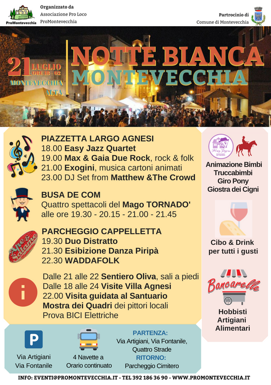Per i bambini sono inoltre state pensate numerose attività: ci sarà infatti l’Animazione Bimbi, il Truccabimbi, il Giro Pony e la Giostra dei Cigni. Ci saranno poi cibi e drink per tutti i gusti. Tantissimi anche gli hobbisti, gli artigiani e gli alimentari. Questa è la quinta edizione della Notte Bianca che si svolge a Montevecchia con il patrocinio del Comune.