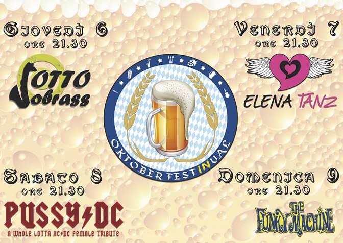 Ogni sera alle 21.30 inizierà un appuntamento musicale. Ad aprire il fine settimana bavarese i Sottosobrass con un repertorio che va dal Rhythm’n’Blues al Funk passando dai successi dance anni ’60 e ’70. Venerdì sarà la dance Anni ’90 a movimentare la serata con la talentuosa DJ Elena Tanz. Sabato sera le cinque ragazze della band Pussy/DC vi faranno rivivere la grande passione per la musica degli AC/DC. A chiusura del fine settimana domenica si tornerà a ballare la disco dance con la band tributeThe Funky Machine.
