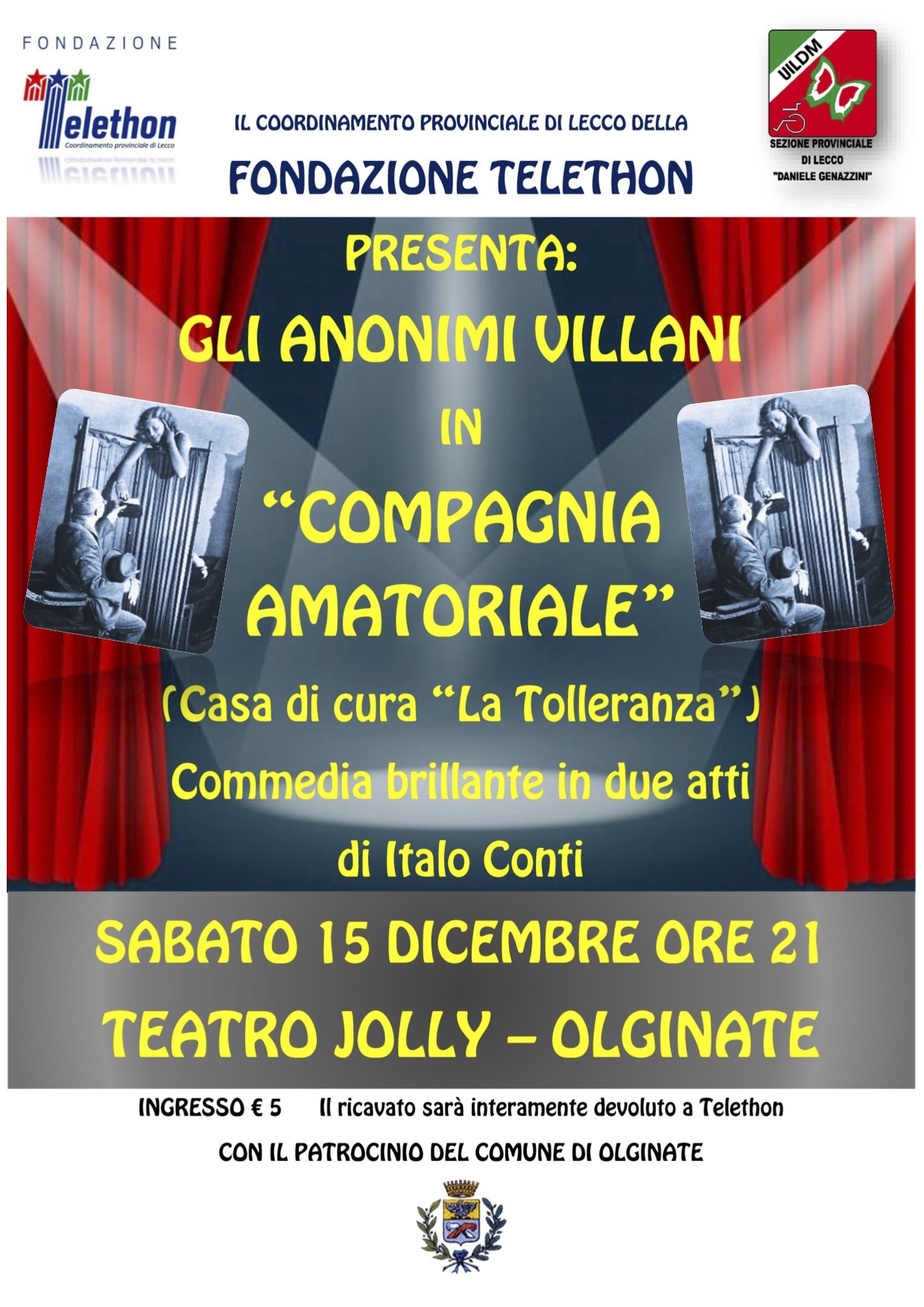 “Ringraziamo il Comune di Olginate che si rileva essere sempre attento alle tematiche che riguardano i più deboli – commentano i responsabili del Teatro Jolly – Un ringraziamento particolare va anche agli Anonimi Villani che sono sempre al fianco di Telethon e che mettono a disposizione la loro arte per aiutare Telethon e per donare speranza ad ogni persona con una malattia genetica per cui non c’è ancora una cura”. Il ricavato sarà devoluto interamente a Telethon.