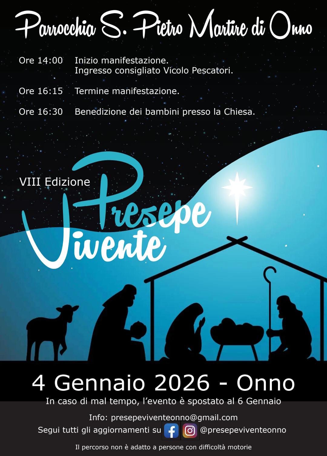 Gli organizzatori, ricordando le cancellazioni degli anni passati a causa del maltempo, hanno deciso di anticipare l’evento al 4 gennaio, rinunciando alla tradizionale data del 6 gennaio. Questo proprio per garantire la migliore riuscita del presepe vivente: se le condizioni meteorologiche non fossero favorevoli, l’evento sarà rinviato a martedì 6 gennaio, offrendo comunque al pubblico un’ulteriore occasione per partecipare.