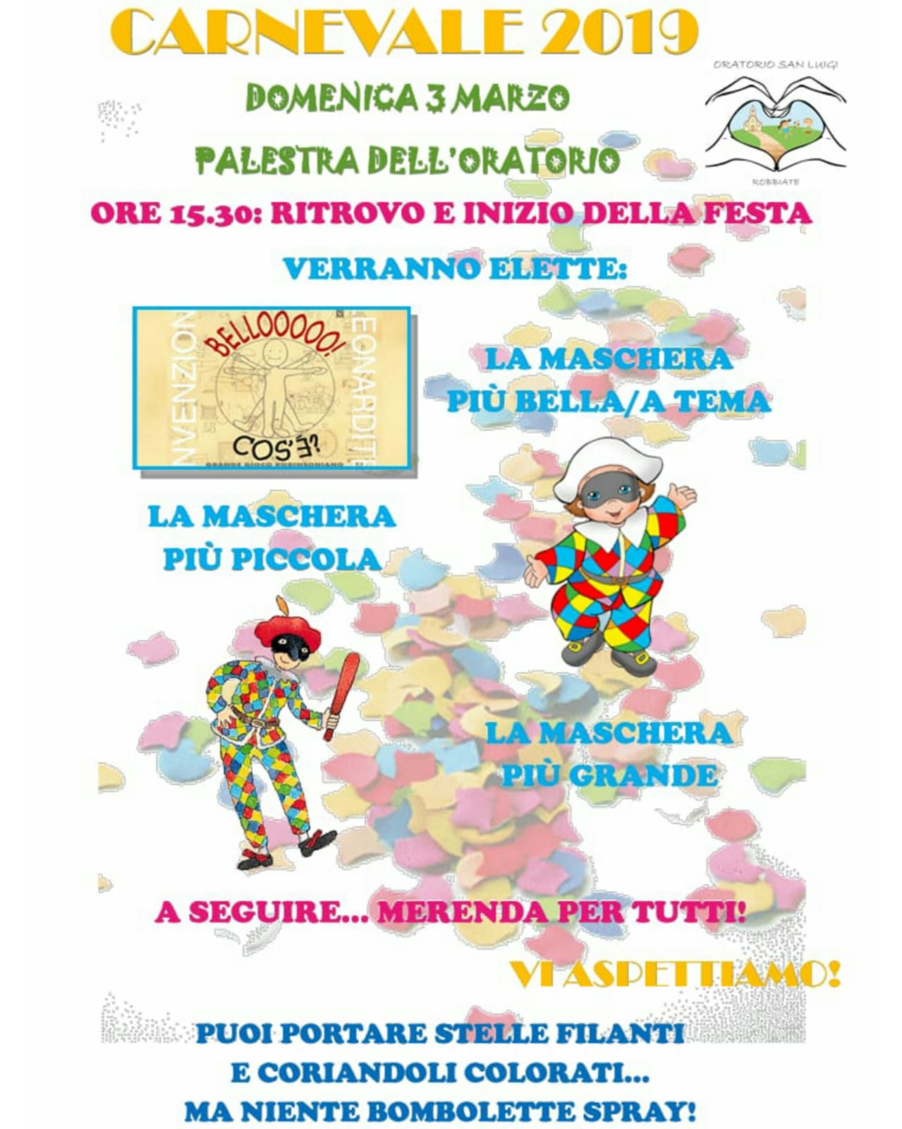 L’oratorio di Robbiate organizza una grande festa di carnevale all’interno della loro palestra che si terrà domenica 3 marzo.