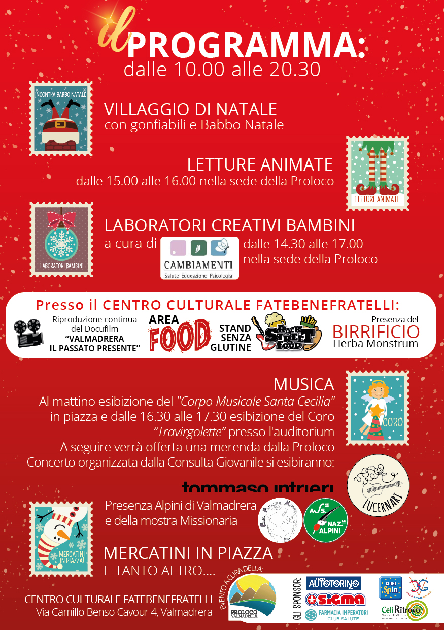 L’evento “Atmosfere natalizie”, come l’anno precedente, si svolgerà al centro culturale Fatebenefratelli domenica 15 dicembre. Saranno messi a disposizione gonfiabili gratuiti per i bambini. Inoltre, sarà possibile prendere parte ai laboratori a cura del centro “ Cambiamenti” ed assistere all’esibizione del coro Travirgolette e del corpo musicale Santa Cecilia.