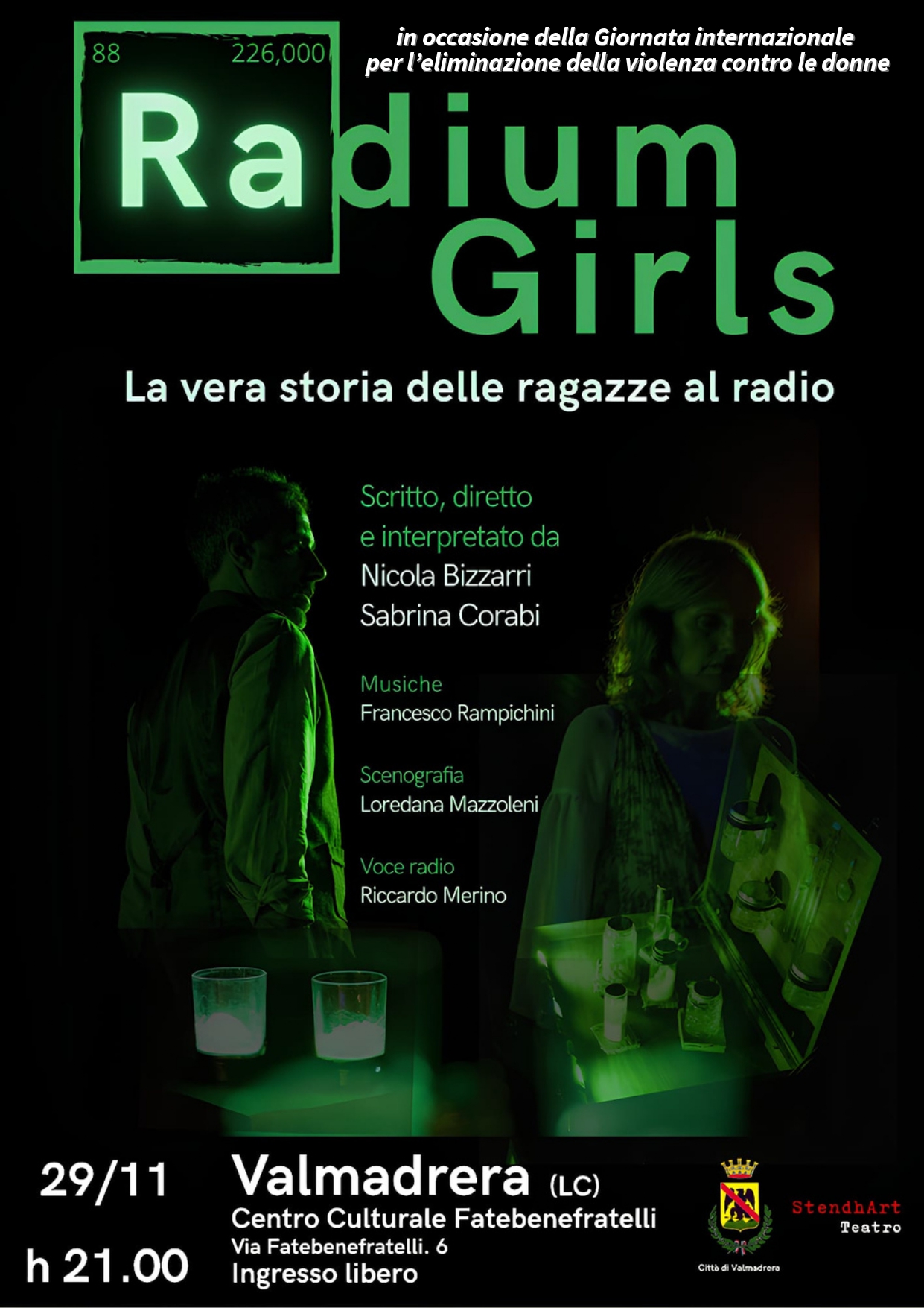 Nell’ambito della stagione culturale autunnale del Comune di Valmadrera va in scena lo spettacolo Radium Girls – La vera storia delle ragazze al radio, scritto, diretto e interpretato da Nicola Bizzarri e Sabrina Corabi, con musiche di Francesco Rampichini, scenografia e costumi di Loredana Mazzoleni e voce narrante di Riccardo Merino. La produzione è a cura di Stendhart Teatro.
