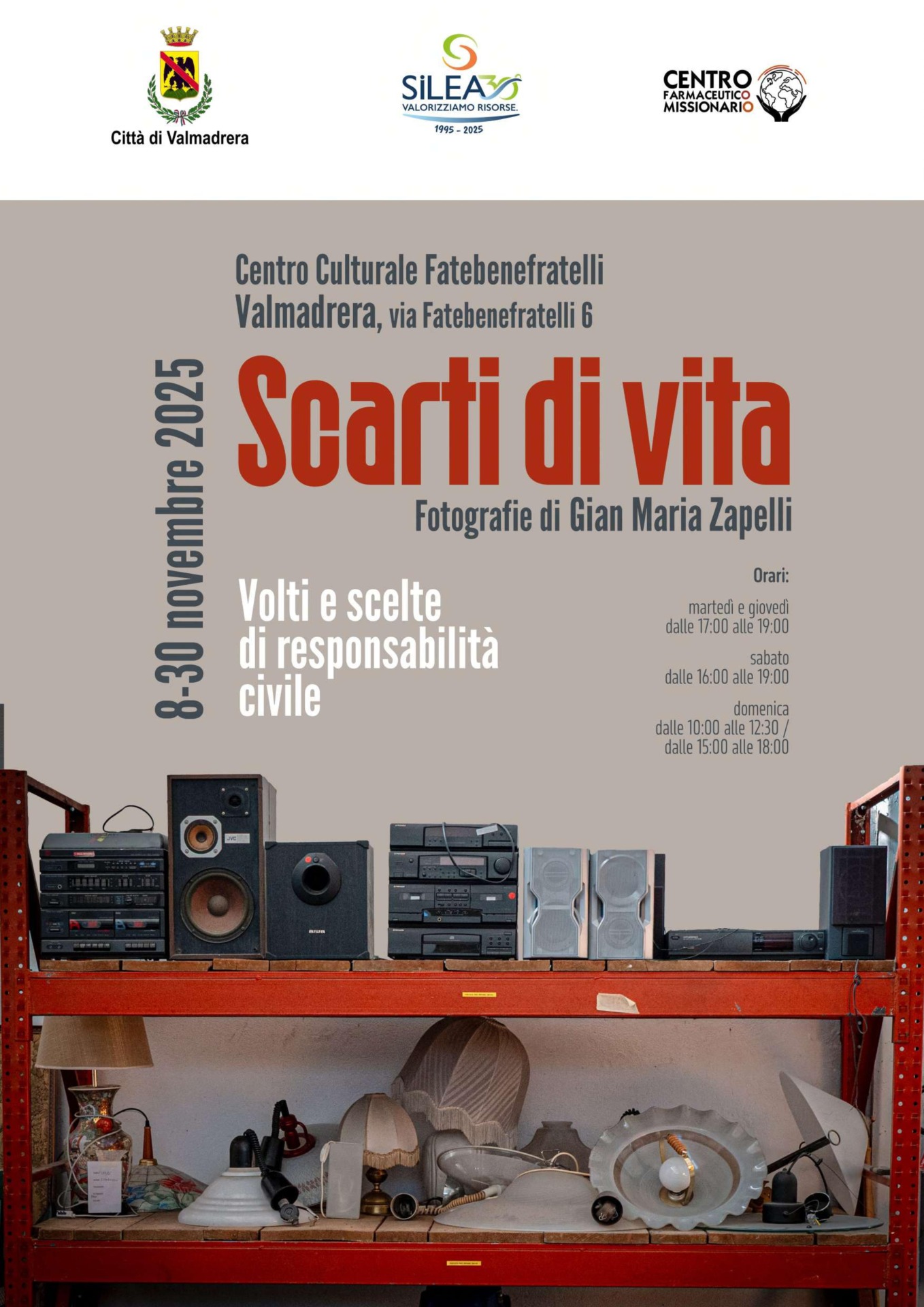 Conclude la presidente di Silea, Francesca Rota: “La mostra Scarti di Vita racchiude una serie di ritratti che colgono uomini e donne nel gesto – tanto semplice quanto simbolico – di separarsi da un oggetto presso i centri di raccolta e presso i centri del riuso.  Un gesto che segna la fine di un ciclo e, al tempo stesso, l’inizio di un altro: la possibilità di avere una seconda vita grazie al riuso, oppure di assumere una nuova forma mediante il riciclo. Sono immagini di grande forza evocativa, capaci di raccontare in un solo scatto diversi piani narrativi. Ci sono le storie passate degli oggetti, che hanno accompagnato le nostre vite e hanno esaurito la loro funzione; ci sono le storie presenti dei cittadini che scelgono comportamenti responsabili; e ci sono infine le storie future, quelle che gli oggetti torneranno a raccontare trasformandosi in nuove risorse. Silea ha sostenuto con convinzione ed entusiasmo il progetto di Gian Maria Zapelli: con questa mostra, l’arte si fa strumento di consapevolezza, capace di sensibilizzare e ispirare, di mostrare come anche nei gesti più comuni possa nascondersi una bellezza che parla di rispetto per le persone, per le cose e per il pianeta”.