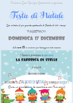 Dalle ore 15, presso l’oratorio di Casatenovo, sarà possibile assistere allo spettacolo di Natale. I bambini di San Giorgio infatti porteranno in scena “La fabbrica di stelle”. Domenica sarà così un’occasione per festeggiare insieme una delle feste più amate. A seguire ci sarà inoltre la possibilità di condividere la merenda. A conclusione del pomeriggio si accenderà anche l’albero di Natale e avverrà il rituale scambio di auguri. Per chi vuole sarà poi possibile scambiarsi i doni liberamente. Ad ogni bambino è dunque consigliato di portare un dono da condividere con i propri amici.