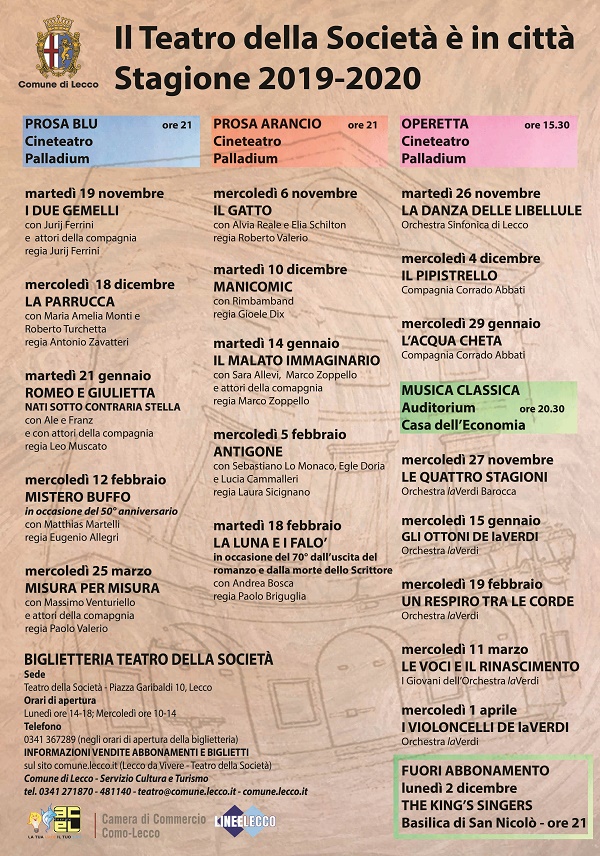 La nuova stagione teatrale del Comune di Lecco “Il Teatro della Società è in città” propone spettacoli di prosa (arancio e blu), concerti di musica classica e operetta, che prenderanno il via mercoledì 6 novembre con “Il gatto” di Roberto Valerio dal romanzo di Georges Simenon, la prosa di debutto del cartellone.I palcoscenici saranno il Cineteatro Palladium per la prosa e l’operetta e l’Auditorium Casa dell’Economia per i concerti di musica classica, con l’aggiunta di una grande serata di musica alla Basilica di San Nicolò, fuori abbonamento, lunedì 2 dicembre alle 21, con il concerto dei The King’s Singers, gruppo vocale di fama mondiale nato a Cambridge nel 1968, con ingresso libero ritirando l’invito presso la biglietteria del Teatro della Società dal 25 novembre (agli abbonati l’invito verrà consegnato contestualmente al ritiro dell’abbonamento).