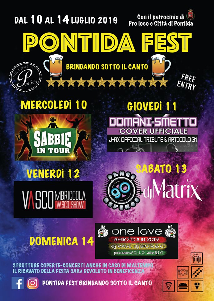 Da 12 anni ormai il gruppo “Giovani Pontida” prepara per mesi il festival pontidese estivo che si svolge nell’area feste adiacente alla strada statale Briantea. Grazie alla musica, all’ottimo servizio bar e alla buona cucina, attira un numero sempre maggiore di visitatori da tutto il territorio circostante. Il programma prevede: mercoledì 10 luglio “Sabbie in Tour”, giovedì 11 luglio “Domani Smetto” cover ufficiale di J-Ax e degli Articolo 31, venerdì 12 luglio “Vascombriccola”, sabato 13 luglio Dj Matrix e in chiusura domenica 14 luglio si ballerà afro con Dj Borgo e Dj Vavi, percussion Millo e voce Bio. Tutto il ricavato sarà devoluto in beneficenza.