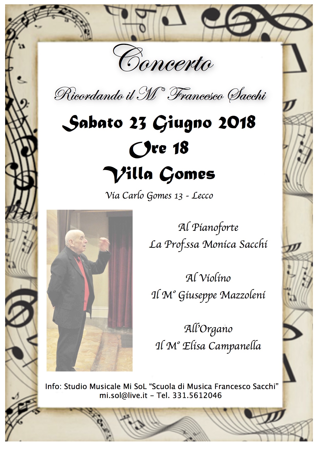 Sabato 23 giugno Lecco rede omaggio a un grande uomo che non c’è più. Alle 18 a Villa Gomes infatti si terrà un concerto in ricordo del maestro Francesco Sacchi.