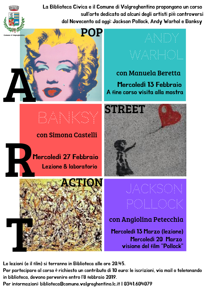 La biblioteca civica insieme al Comune di Valgreghentino propongono un corso sull’arte: pop, street e action, che sarà incentrato sugli artisti: Jackson Pollock, Andy Warhol e Banksy, alcuni dei più controversi dall’inizio del Novecento ad oggi. Il corso che comprenderà tre lezioni più la visione di un film, inizierà il 13 febbraio e terminerà il 27 marzo. Gli incontri si svolgeranno tutti alle 20.45 presso la biblioteca civica del paese. La prima lezione, del corso sarà il 13 febbraio, si parlerà di arte pop, affrontando l’artista Andy Warhol insieme a Manuela Beretta. Il 27 febbraio, nel secondo appuntamento si parlerà dell’artista street Banksy, con lezione e laboratorio a cura di Simona Castelli. Nell’ultima lezione del 20 marzo si affronterà l’arte action di Jackson Pollock con Angiolina Petecchia; mentre l’omonimo film sarà proiettato il giorno 27 marzo. Per partecipare al corso è richiesto un contributo di 10 euro. Le iscrizioni dovranno pervenire entro l’8 febbraio. Sarà possibile iscriversi tramite e-mail all’indirizzo biblioteca@comune.valgreghentino.lc.it o telefonando direttamente alla biblioteca al numero 0341.604079.