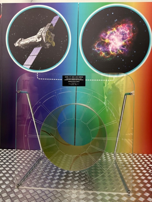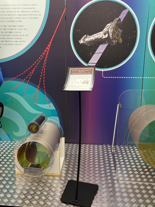 I protagonisti della sala espositiva sono gli oggetti, mentre le stampe fanno da sfondo. Si parte dai telescopi, dal modello del primo mai realizzato, quello ad opera di Galileo Galilei, passando per i modelli più recenti, che permettono di osservare l’universo a frequenze diverse dalla luce, come onde radio, infrarossi, raggi X, raggi Gamma. Proprio sui raggi Gamma, a spiccare visivamente è un’imponente struttura metallica con sei specchi esagonali del progetto Astri dell’Inaf, un array di telescopi di altissima tecnologia. Presenti anche gli specchi a raggi X dei telescopi spaziali XMM – Newton e Beppo-SAX costruiti dalla Media Lario Srl di Bosisio Parini. C’è quindi una sezione dedicata alla luna, con il modellino in scala 1:36 del Saturn V, il razzo della missione spaziale Apollo 11, che portò i primi uomini sul nostro satellite. Si passa quindi alla sezione dedicata a Marte, con il modellino dei due rover gemelli – Spirit e Opportunity – lanciate sul pianeta rosso nel 2004. Spazio poi alla postazione degli asteroidi, con il modellino della sonda giapponese Hayabusa, atterrata sull’asteroide Itokawa nel 2005.
