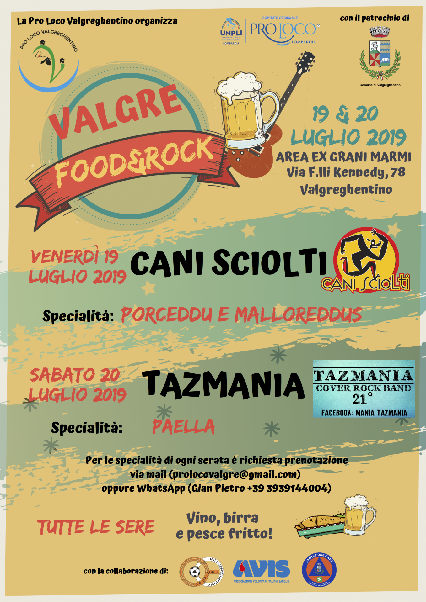 Si parte oggi, venerdì 19 luglio, con la musica dei “Cani Sciolti” e le specialità culinarie sarde porceddu e malloreddus. La seconda serata è in programma domani, sabato 20 luglio: protagonista la paella spagnola e la musica della cover band rock “Tazmania”. Per le specialità di ogni serata è richiesta prenotazione via mail a prolocovalgre@gmail.com oppure via WhatsApp a Gian Pietro al numero 393.9144004.