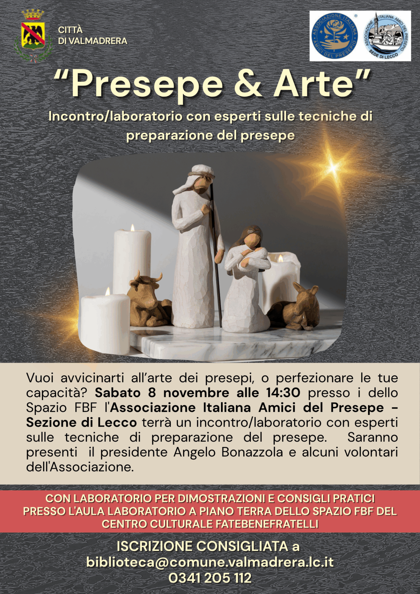 Vuoi avvicinarti all’arte dei presepi, o perfezionare le tue capacità? La Città di Valmadrera invita la cittadinanza tutta, gli appassionati o semplicemente coloro che vogliono saperne di più ed avvicinarsi alla presepistica a partecipare all’incontro/laboratorio “Presepe & Arte”, in programma sabato 8 novembre 2025 alle 14.30 nell’aula laboratorio a piano terra dello Spazio FBF al centro culturale Fatebenefratelli.