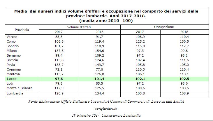Dati in crescita per il settore terziario: nel 4° trimestre 2018 il volume d’affari sia nel commercio che nei servizi mostra il segno “più” (rispettivamente +5,6% e +0,9%, contro il +1,3% e +10,3% regionale). L’indice medio 2018 del volume d’affari delle imprese commerciali lecchesi si è attestato a 89,4 (+3,4% rispetto al 2017), quello dei servizi a 101,4 (+3,9% rispetto al 2017). In Lombardia i due valori si sono attestati rispettivamente a 81,3 e 134,4 (entrambi in aumento, seppur molto differenziato: +0,1% per il commercio e +11,1% per i servizi). Negli ultimi tre mesi del 2018 è cresciuta l’occupazione sia nel commercio (+0,4% la variazione rispetto al trimestre precedente) che nei servizi (+0,5%). L’indice medio dell’occupazione nello scorso anno si è attestato a 99,2 nel commercio (+1,9% nei confronti del 2017) e a 102,5 nei servizi (+0,4% rispetto al 2017). In Lombardia i relativi valori sono 98,8 e 109,9 (rispettivamente +1,9% e +2,9%).